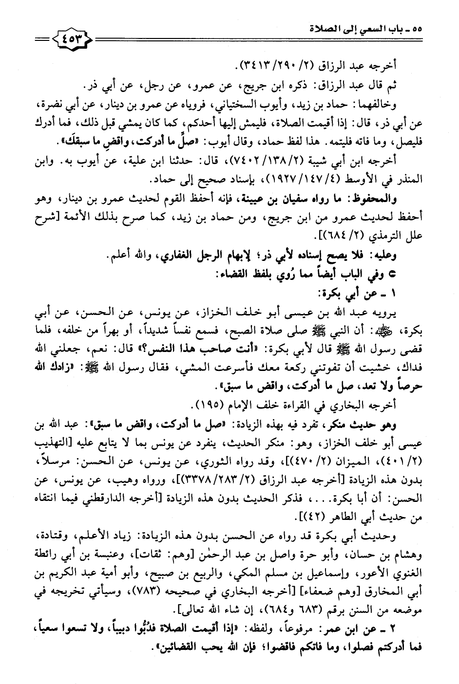 وهو حديث منكر، تفرد فيه بهذه الزيادة: "صل ما أدركت، واقض ما سبق": عبد الله بن عيسى أبو خلف الخزاز، وهو: منكر الحديث، ينفرد عن يونس بما لا يتابع عليه [التهذيب (٢/ ٤٠١)، الميزان (٢/ ٤٧٠)]، وقد رواه الثوري، عن يونس، عن الحسن: مرسلًا، بدون هذه الزيادة [أخرجه عبد الرزاق (٢/ ٢٨٣/ ٣٣٧٨)]، ورواه وهيب، عن يونس، عن الحسن: أن أبا بكرة ... ، فذكر الحديث بدون هذه الزيادة [أخرجه الدارقطني فيما انتقاه من حديث أبي الطاهر (٤٢)].
