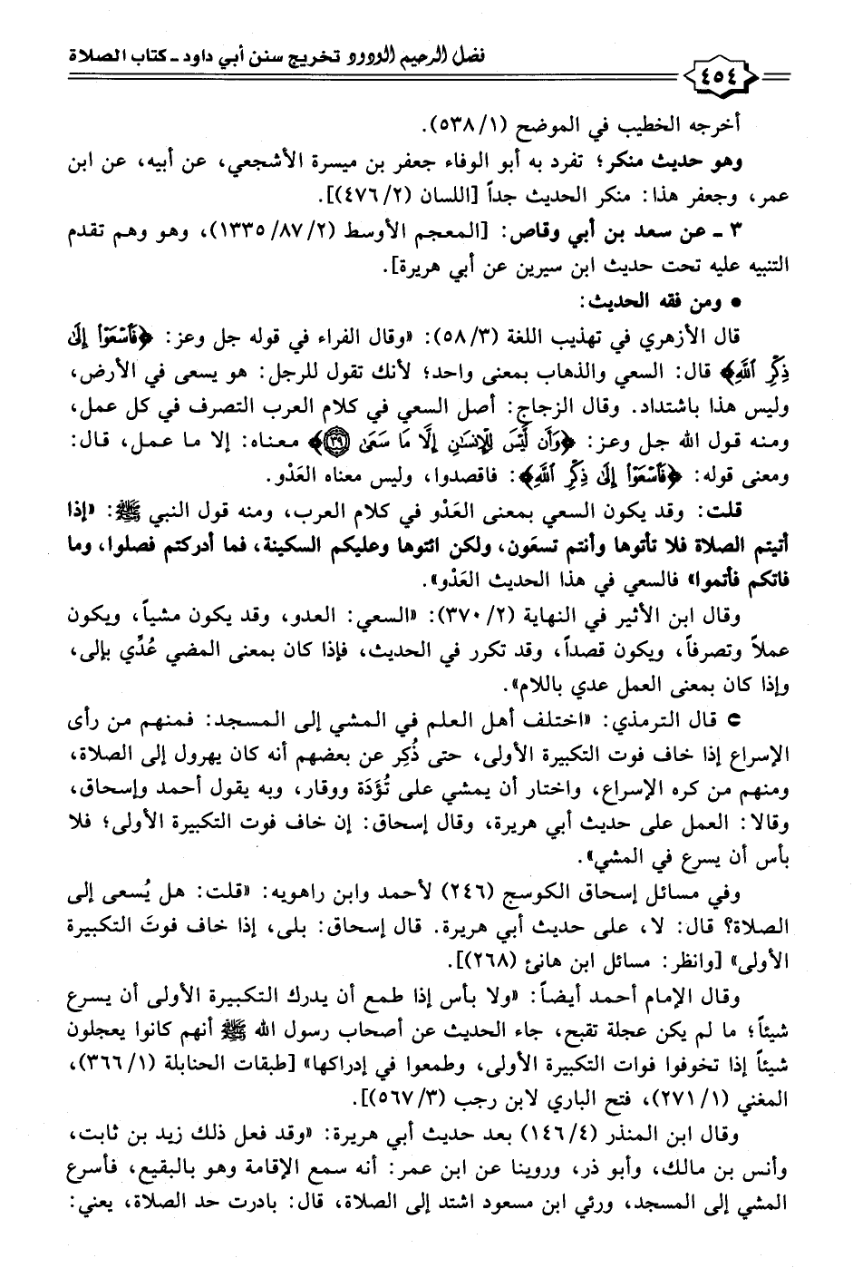 قلت: وقد يكون السعي بمعنى العَدْو في كلام العرب، ومنه قول النبي - صلى الله عليه وسلم -: "إذا أتيتم الصلاة فلا تأتوها وأنتم تسعَون، ولكن ائتوها وعليكم السكينة، فما أدركتم فصلوا، وما فاتكم فأتموا" فالسعي في هذا الحديث العَدْو".
