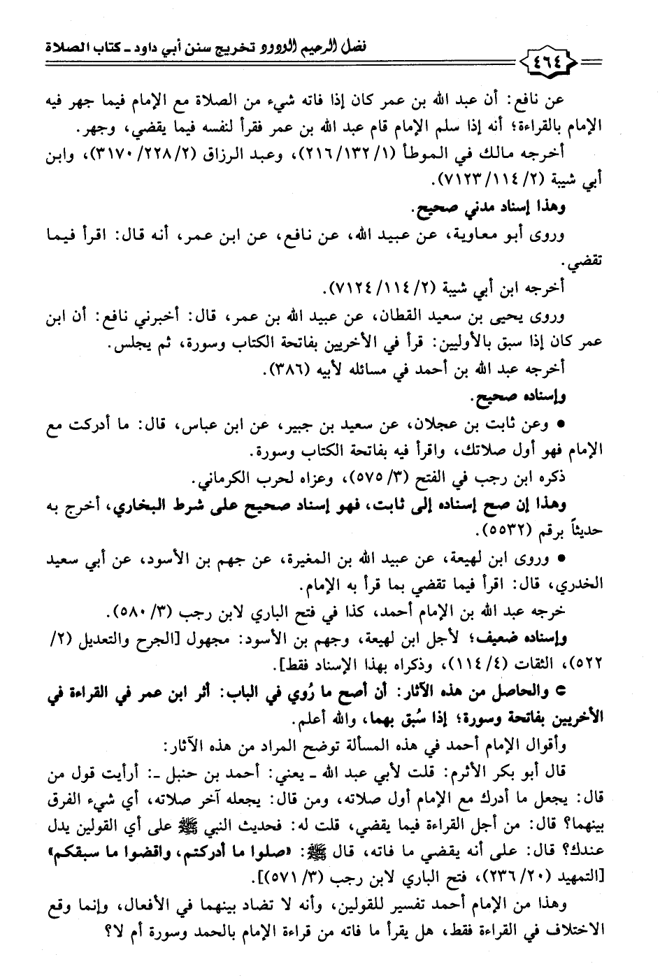 • والحاصل من هذه الآثار: أن أصح ما رُوي في الباب: أثر ابن عمر في القراءة في الأخريين بفاتحة وسورة؛ إذا سُبق بهما، والله أعلم.