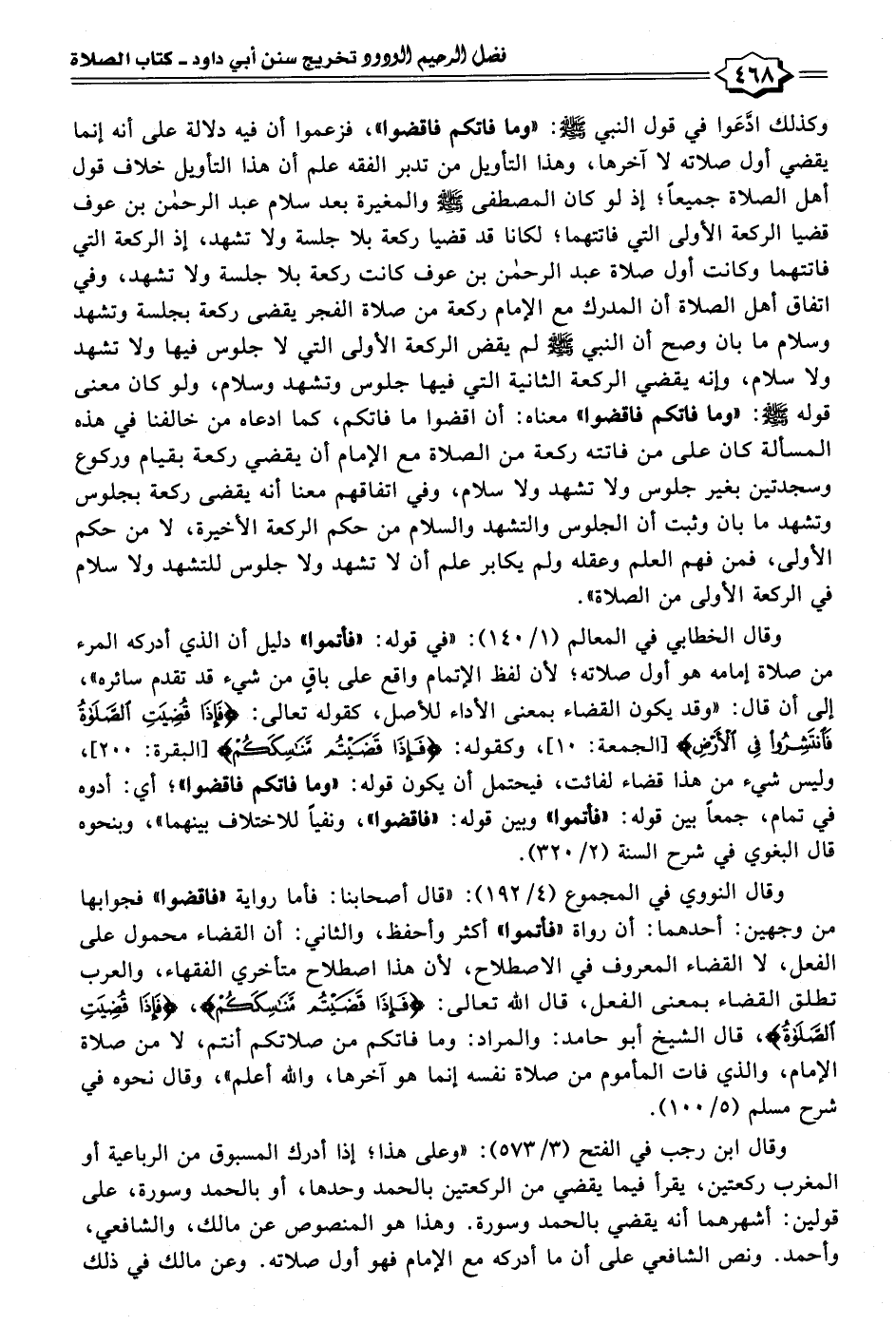 وكذلك ادَّعَوا في قول النبي - صلى الله عليه وسلم -: "وما فاتكم فاقضوا"، فزعموا أن فيه دلالة على أنه إنما يقضي أول صلاته لا آخرها، وهذا التأويل من تدبر الفقه علم أن هذا التأويل خلاف قول أهل الصلاة جميعًا؛ إذ لو كان المصطفى - صلى الله عليه وسلم - والمغيرة بعد سلام عبد الرحمن بن عوف قضيا الركعة الأولى التي فاتتهما؛ لكانا قد قضيا ركعة بلا جلسة ولا تشهد، إذ الركعة التي فاتتهما وكانت أول صلاة عبد الرحمن بن عوف كانت ركعة بلا جلسة ولا تشهد، وفي اتفاق أهل الصلاة أن المدرك مع الإمام ركعة من صلاة الفجر يقضى ركعة بجلسة وتشهد وسلام ما بان وصح أن النبي - صلى الله عليه وسلم - لم يقض الركعة الأولى التي لا جلوس فيها ولا تشهد ولا سلام، وإنه يقضي الركعة الثانية التي فيها جلوس وتشهد وسلام، ولو كان معنى قوله - صلى الله عليه وسلم -: "وما فاتكم فاقضوا" معناه: أن اقضوا ما فاتكم، كما ادعاه من خالفنا في هذه المسألة كان على من فاتته ركعة من الصلاة مع الإمام أن يقضي ركعة بقيام وركوع وسجدتين بغير جلوس ولا تشهد ولا سلام، وفي اتفاقهم معنا أنه يقضى ركعة بجلوس وتشهد ما بان وثبت أن الجلوس والتشهد والسلام من حكم الركعة الأخيرة، لا من حكم الأولى، فمن فهم العلم وعقله ولم يكابر علم أن لا تشهد ولا جلوس للتشهد ولا سلام في الركعة الأولى من الصلاة".