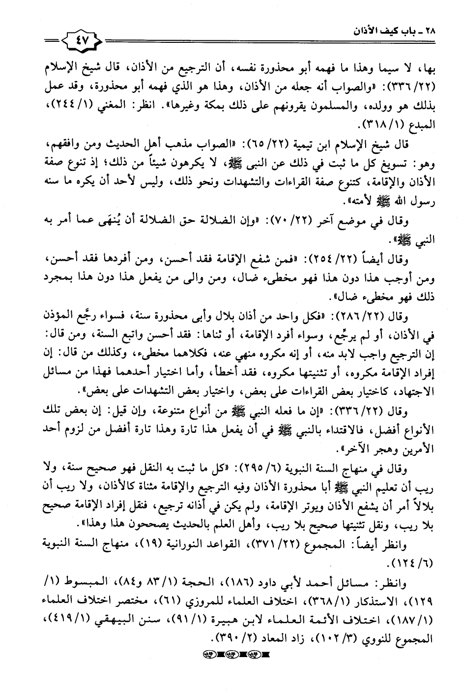 قال شيخ الإسلام ابن تيمية (٢٢/ ٦٥): "الصواب مذهب أهل الحديث ومن وافقهم، وهو: تسويغ كل ما ثبت في ذلك عن النبي - صلى الله عليه وسلم -، لا يكرهون شيئًا من ذلك؛ إذ تنوع صفة الأذان والإقامة، كتنوع صفة القراءات والتشهدات ونحو ذلك، وليس لأحد أن يكره ما سنه رسول الله - صلى الله عليه وسلم - لأمته".