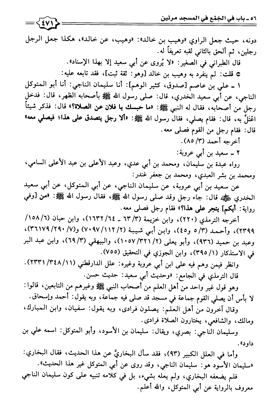 ١ - علي بن عاصم [صدوق، كثير الوهم]: أنا سليمان الناجي: أنا أبو المتوكل الناجي، عن أبي سعيد الخدري، قال: صلى رسول الله - صلى الله عليه وسلم - بأصحابه الظهر، قال: فدخل رجل من أصحابه، فقال له النبي - صلى الله عليه وسلم -: "ما حبسك يا فلان عن الصلاة؟ " قال: فذكر شيئًا اعْتَلَّ به، قال: فقام يصلي، فقال رسول الله - صلى الله عليه وسلم -: "ألا رجل يتصدق على هذا؛ فيصلي معه" قال: فقام رجل من القوم فصلى معه.