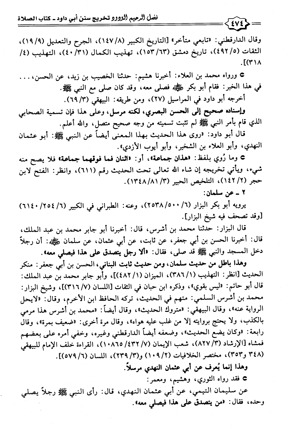 عن سليمان التيمي، عن أبي عثمان النهدي، قال: رأى النبي - صلى الله عليه وسلم - رجلًا يصلى وحده، فقال: "من يتصدق على هذا فيصلي معه".