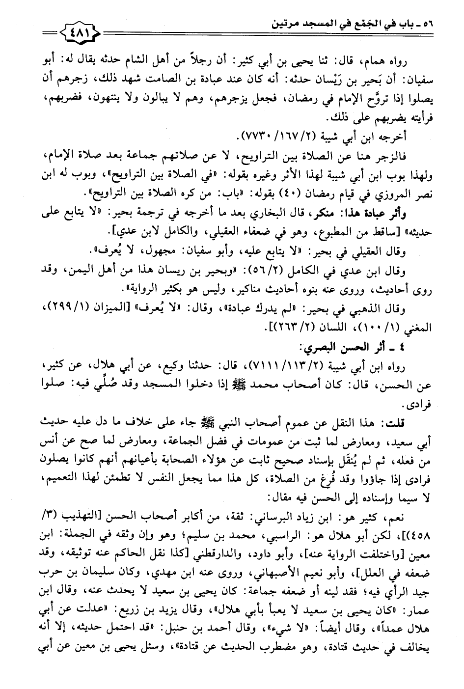 رواه همام، قال: ثنا يحيى بن أبي كثير: أن رجلًا من أهل الشام حدثه يقال له: أبو سفيان: أن بَحير بن رَيْسان حدثه: أنه كان عند عبادة بن الصامت شهد ذلك، زجرهم أن يصلوا إذا تروَّح الإمام في رمضان، فجعل يزجرهم، وهم لا يبالون ولا ينتهون، فضربهم، فرأيته يضربهم على ذلك.