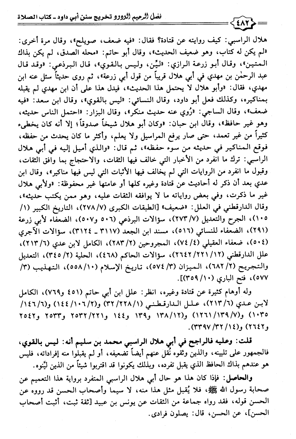 هلال الراسبي: كيف روايته عن قتادة؟ فقال: "فيه ضعف، صويلح"، وقال مرة أخرى: "لم يكن له كتاب، وهو ضعيف الحديث"، وقال أبو حاتم: "محله الصدق، لم يكن بذاك المتين"، وقال أبو زرعة الرازي: "ليِّن، وليس بالقوي"، قال البرذعي: "وقد قال عبد الرحمن بن مهدي في أبي هلال قريبًا من قول أبي زرعة"، ثم روى حديثًا سئل عنه ابن مهدي، فقال: "وأبو هلال لا يحتمل هذا الحديث"، فيدل هذا على أن ابن مهدي لم يقبله بمناكيره، وكذلك فعل أبو داود، وقال النسائي: "ليس بالقوي"، وقال ابن سعد: "فيه ضعف"، وقال الساجي: "رُوي عنه حديث منكر"، وقال البزار: "احتمل الناس حديثه، وهو غير حافظ"، وقال ابن حبان: "وكان أبو هلال شيخًا صدوقًا؛ إلا أنه كان يخطئ كثيرًا من غير تعمد، حتى صار يرفع المراسيل ولا يعلم، وأكثر ما كان يحدث من حفظه، فوقع المناكير في حديثه من سوء حفظه"، ثم قال: "والذي أميل إليه في أبي هلال الراسبي: ترك ما انفرد من الأخبار التي خالف فيها الثقات، والاحتجاج بما وافق الثقات، وقبول ما انفرد من الروايات التي لم يخالف فيها الأثبات التي ليس فيها مناكير"، وقال ابن عدي بعد أن ذكر له أحاديث عن قتادة وغيره كلها أو عامتها غير محفوظة: "ولأبي هلال غير ما ذكرت، وفي بعض رواياته ما لا يوافقه الثقات عليه، وهو ممن يكتب حديثه"، وقال الدارقطني في العلل: "ضعيف" [الطبقات الكبرى (٧/ ٢٧٨)، التاريخ الكبير (١/ ١٠٥)، الجرح والتعديل (٧/ ٢٧٣)، سؤالات البرذعي (٥٠٦ و ٥٠٧)، الضعفاء لأبي زرعة (٢٩١)، الضعفاء للنسائي (٥١٦)، مسند ابن الجعد (٣١١٧ - ٣١٢٤)، سؤالات الآجري (٥٠٤)، ضعفاء العقيلي (٤/ ٧٤)، المجروحين (٢/ ٢٨٣)، الكامل لابن عدي (٦/ ٢١٣)، علل الدارقطني (١٢/ ٢٢١/ ٢٦٤٢)، سؤالات الحاكم (٤٦٨)، الحلية (٢/ ٣٤٥)، التعديل والتجريح (٢/ ٦٨٢)، الميزان (٣/ ٥٧٤)، تاريخ الإسلام (١٠/ ٥٥٨)، التهذيب (٣/ ٥٧٧)، فتح الباري (١٠/ ٣٥٩)].
