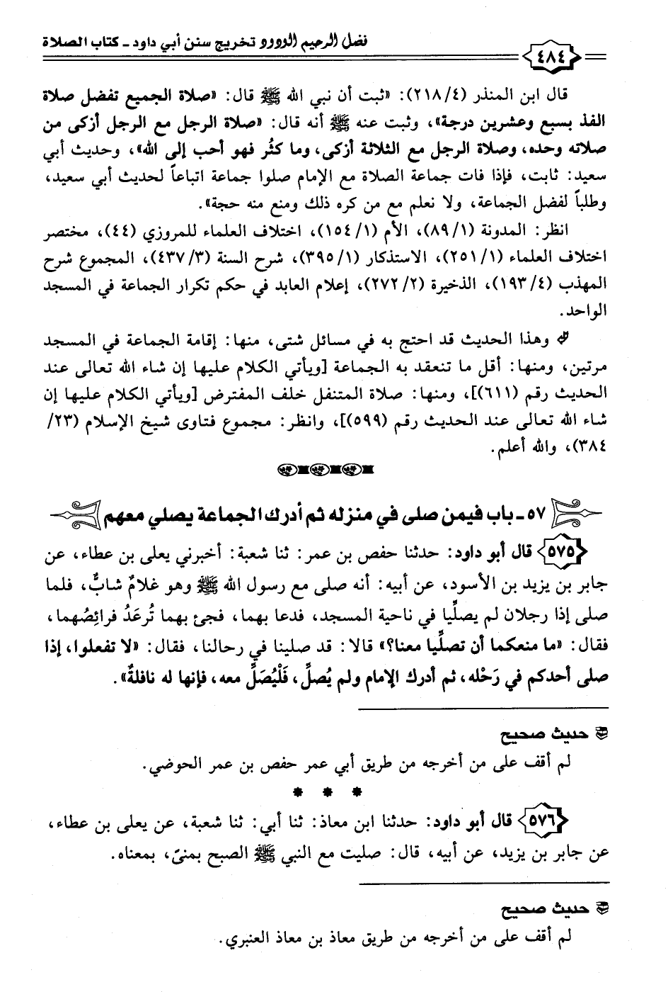 ٥٧٥ - قال أبو داود: حدثنا حفص بن عمر: ثنا شعبة: أخبرني يعلى بن عطاء، عن جابر بن يزيد بن الأسود، عن أبيه: أنه صلى مع رسول الله - صلى الله عليه وسلم - وهو غلامٌ شابٌّ، فلما صلى إذا رجلان لم يصلِّيا في ناحية المسجد، فدعا بهما، فجئ بهما تُرعَدُ فرائِصُهما، فقال: "ما منعكما أن تصلِّيا معنا؟ " قالا: قد صلينا في رحالنا، فقال: "لا تفعلوا، إذا صلى أحدكم في رَحْله، ثم أدرك الإمام ولم يُصلِّ، فَلْيُصَلِّ معه، فإنها له نافلةٌ".