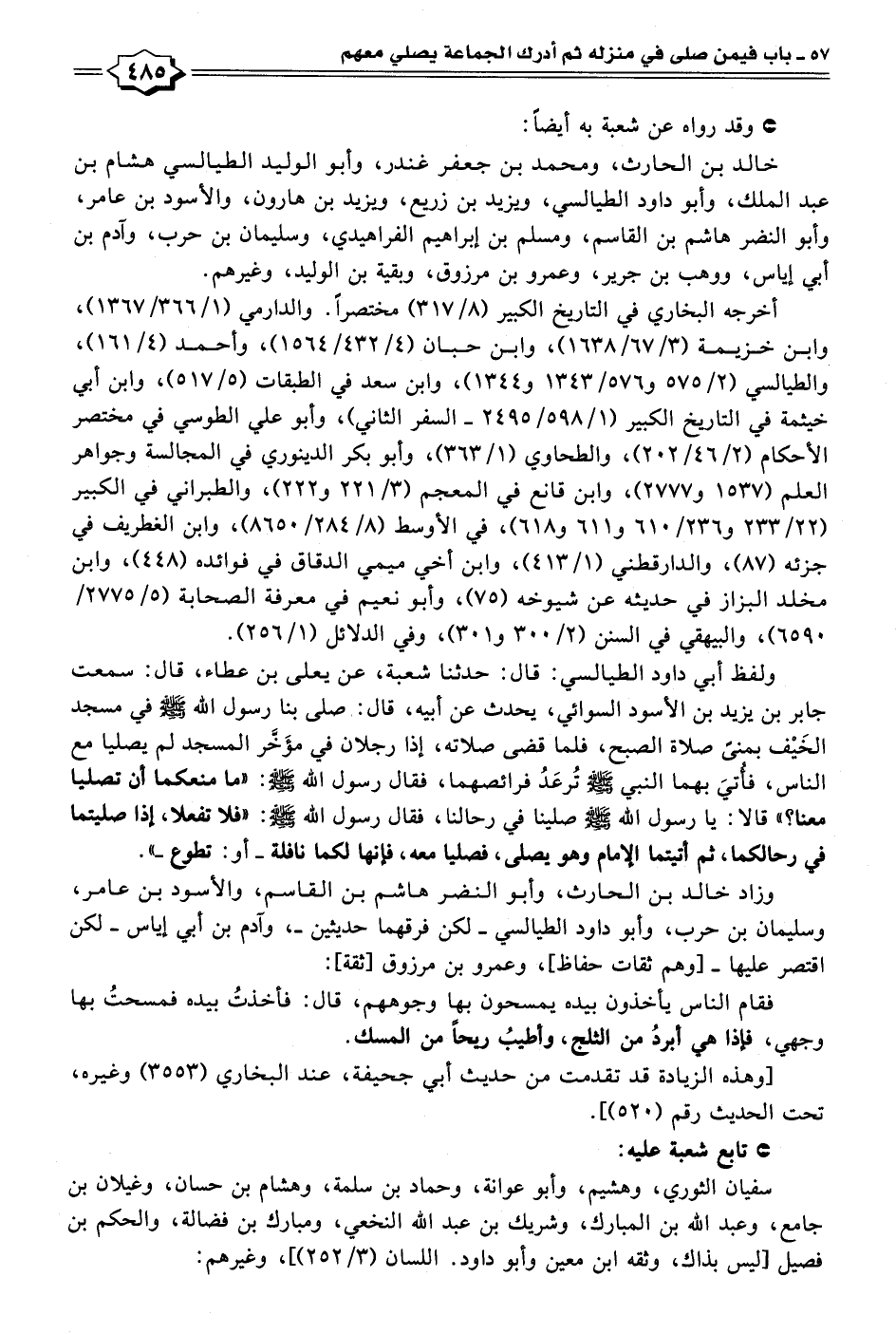ولفظ أبي داود الطيالسي: قال: حدثنا شعبة، عن يعلى بن عطاء، قال: سمعت جابر بن يزيد بن الأسود السوائي، يحدث عن أبيه، قال: صلى بنا رسول الله - صلى الله عليه وسلم - في مسجد الخَيْف بمنىً صلاة الصبح، فلما قضى صلاته، إذا رجلان في مؤَخَّر المسجد لم يصليا مع الناس، فأُتيَ بهما النبي - صلى الله عليه وسلم - تُرعَدُ فرائصهما، فقال رسول الله - صلى الله عليه وسلم -: "ما منعكما أن تصليا معنا؟ " قالا: يا رسول الله - صلى الله عليه وسلم - صلينا في رحالنا، فقال رسول الله - صلى الله عليه وسلم -: "فلا تفعلا، إذا صليتما في رحالكما، ثم أتيتما الإمام وهو يصلى، فصليا معه، فإنها لكما نافلة -أو: تطوع-".