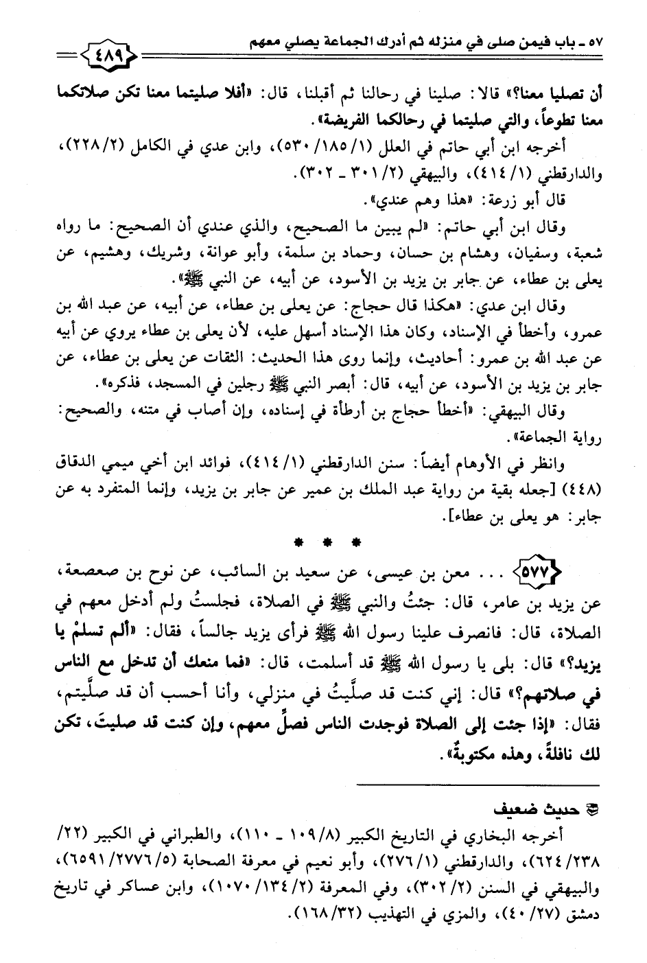 ٥٧٧ - معن بن عيسى، عن سعيد بن السائب، عن نوح بن صعصعة، عن يزيد بن عامر، قال: جئتُ والنبي - صلى الله عليه وسلم - في الصلاة، فجلستُ ولم أدخل معهم في الصلاة، قال: فانصرف علينا رسول الله - صلى الله عليه وسلم - فرأى يزيد جالسًا، فقال: "ألم تسلمْ يا يزيد؟ " قال: بلى يا رسول الله - صلى الله عليه وسلم - قد أسلمت، قال: "فما منعك أن تدخل مع الناس في صلاتهم؟ " قال: إني كنت قد صلَّيتُ في منزلي، وأنا أحسب أن قد صلَّيتم، فقال: "إذا جئت إلى الصلاة فوجدت الناس فصلِّ معهم، وإن كنت قد صليتَ، تكن لك نافلةً، وهذه مكتوبةٌ".
