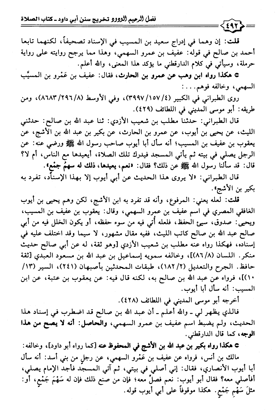 • هكذا رواه بكير بن عبد الله بن الأشج في المحفوظ عنه [كما رواه أبو داود]، وخالفه: مالك بن أنس، فرواه عن عفيف بن عَمْرو السهمي، عن رجلٍ من بني أسد: أنه سأل أبا أيوب الأنصاري، فقال: إني أصلي في بيتي، ثم آتي المسجد فأجد الإمام يصلي، أفأصلي معه؟ فقال أبو أيوب: نعم فصلِّ معه؛ فإن من صنع ذلك فإن له سَهْمَ جَمْعٍ، أو: مثلَ سَهْمِ جَمْعٍ. هكذا موقوفًا على أبي أيوب قوله.