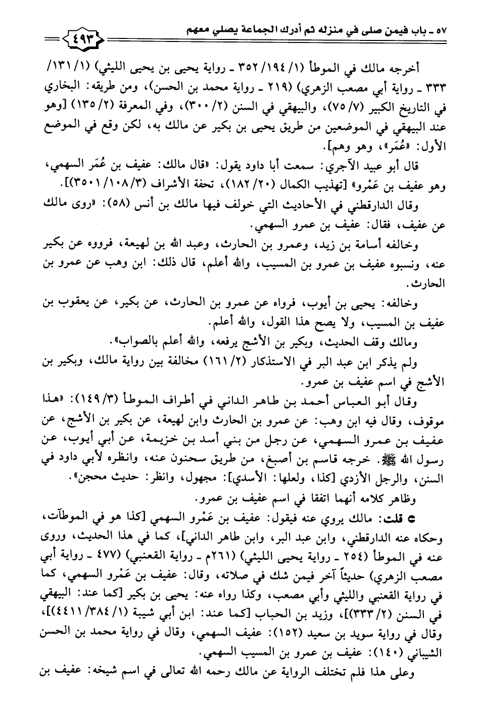 • قلت: مالك يروي عنه فيقول: عفيف بن عَمْرو السهمي [كذا هو في الموطآت، وحكاه عنه الدارقطني، وابن عبد البر، وابن طاهر الداني]، كما في هذا الحديث، وروى عنه في الموطأ (٢٥٤ - رواية يحيى الليثي) (٢٦١ م- رواية القعنبي) (٤٧٧ - رواية أبي مصعب الزهري) حديثًا آخر فيمن شك في صلاته، وقال: عفيف بن عَمْرو السهمي، كما في رواية القعنبي والليثي وأبي مصعب، وكذا رواه عنه: يحيى بن بكير [كما عند: البيهقي في السنن (٢/ ٣٣٣)]، وزيد بن الحباب [كما عند: ابن أبي شيبة (١/ ٣٨٤/ ٤٤١١)]، وقال في رواية سويد بن سعيد (١٥٢): عفيف السهمي، وقال في رواية محمد بن الحسن الشيباني (١٤٠): عفيف بن عمرو بن المسيب السهمي.