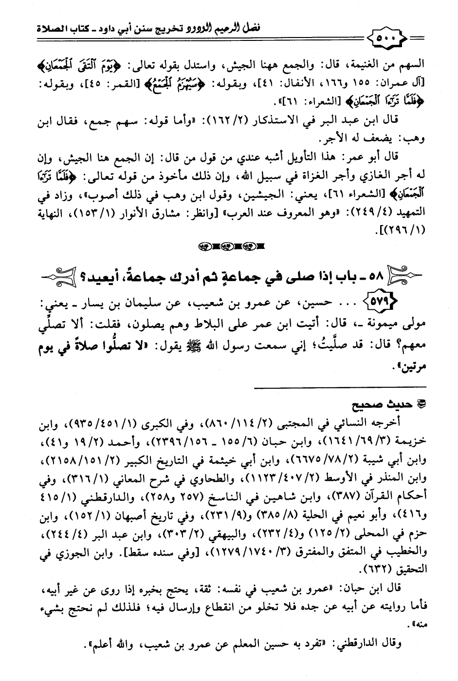 ٥٧٩ - . . . حسين، عن عمرو بن شعيب، عن سليمان بن يسار -يعني: مولى ميمونة-، قال: أتيت ابن عمر على البلاط وهم يصلون، فقلت: ألا تصلِّي معهم؟ قال: قد صلَّيتُ؛ إني سمعت رسول الله - صلى الله عليه وسلم - يقول: "لا تصلُّوا صلاةً في يوم مرتين".