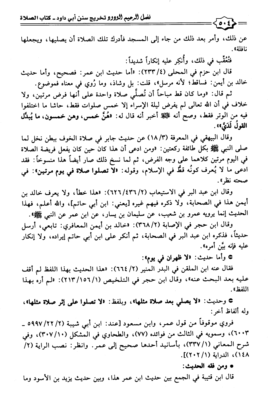وقال البيهقي في المعرفة (٣/ ١٨) عن حديث جابر في صلاة الخوف ببطن نخل لما صلى النبي - صلى الله عليه وسلم - بكل طائفة ركعتين: "ومن ادعى أن هذا كان حين كان يفعل فريضة الصلاة في اليوم مرتين كلاهما على وجه الفرض، ثم لما نسخ ذلك صار أيضًا هذا منسوخًا: فقد ادعى ما لا يُعرف كونُه قطُّ في الإسلام، وقوله: "لا تصلوا صلاة في يوم مرتين": في صحته نظر".