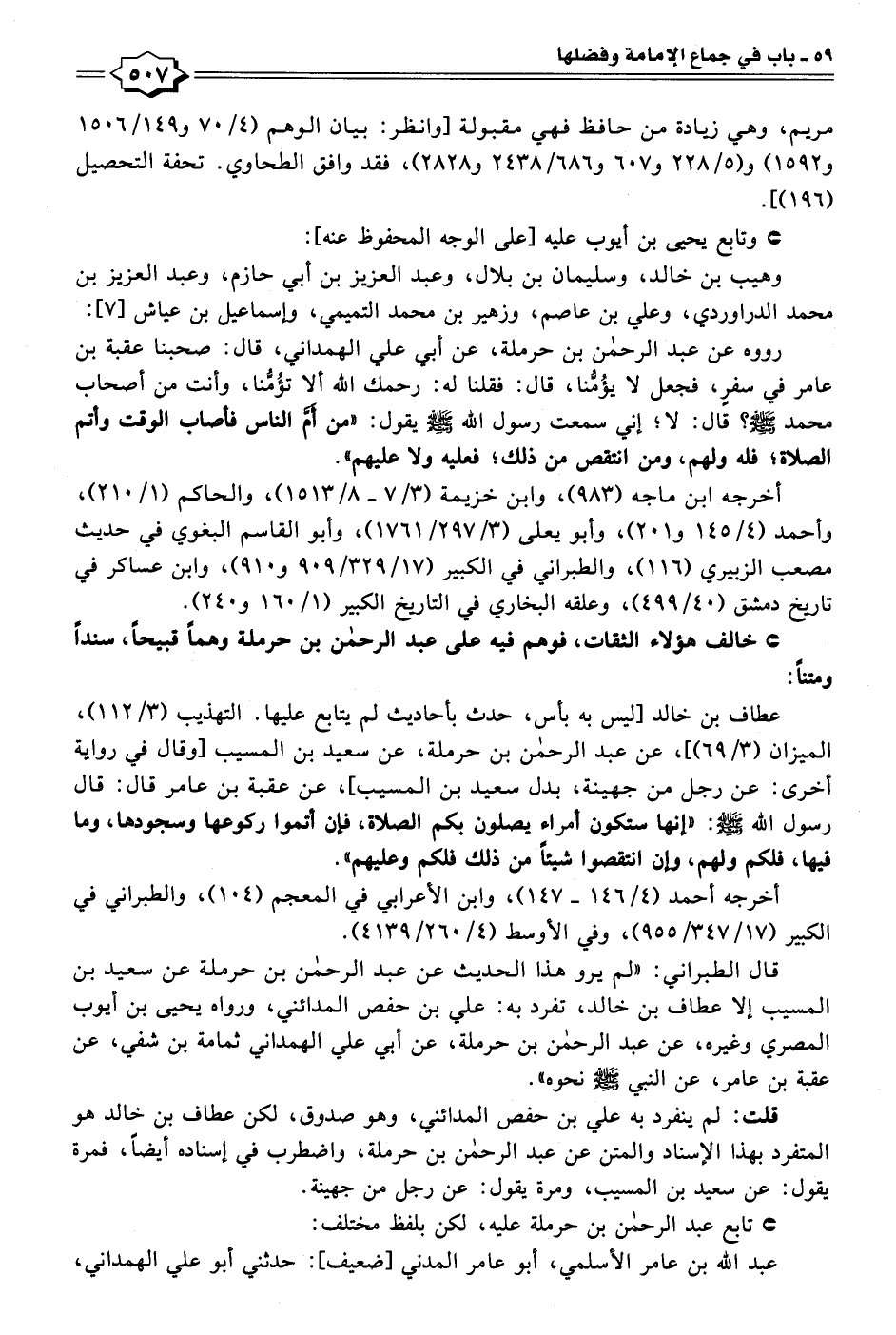 رووه عن عبد الرحمن بن حرملة، عن أبي علي الهمداني، قال: صحبنا عقبة بن عامر في سفرٍ، فجعل لا يؤُمُّنا، قال: فقلنا له: رحمك الله ألا تؤُمُّنا، وأنت من أصحاب محمد - صلى الله عليه وسلم -؟ قال: لا؛ إني سمعت رسول الله - صلى الله عليه وسلم - يقول: "من أمَّ الناس فأصاب الوقت وأتم الصلاة فله ولهم، ومن انتقص من ذلك؛ فعليه ولا عليهم".
