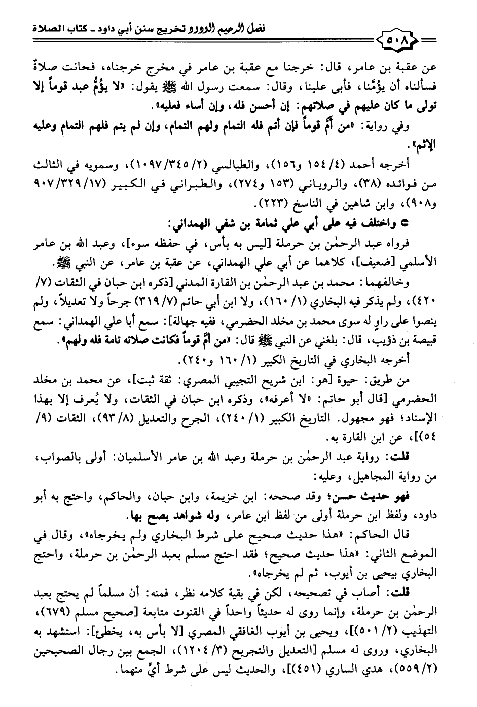 عن عقبة بن عامر، قال: خرجنا مع عقبة بن عامر في مخرج خرجناه، فحانت صلاةٌ فسألناه أن يؤُمَّنا، فأبى علينا، وقال: سمعت رسول الله - صلى الله عليه وسلم - يقول: "لا يؤُمُّ عبد قومًا إلا تولى ما كان عليهم في صلاتهم: إن أحسن فله، وإن أساء فعليه".