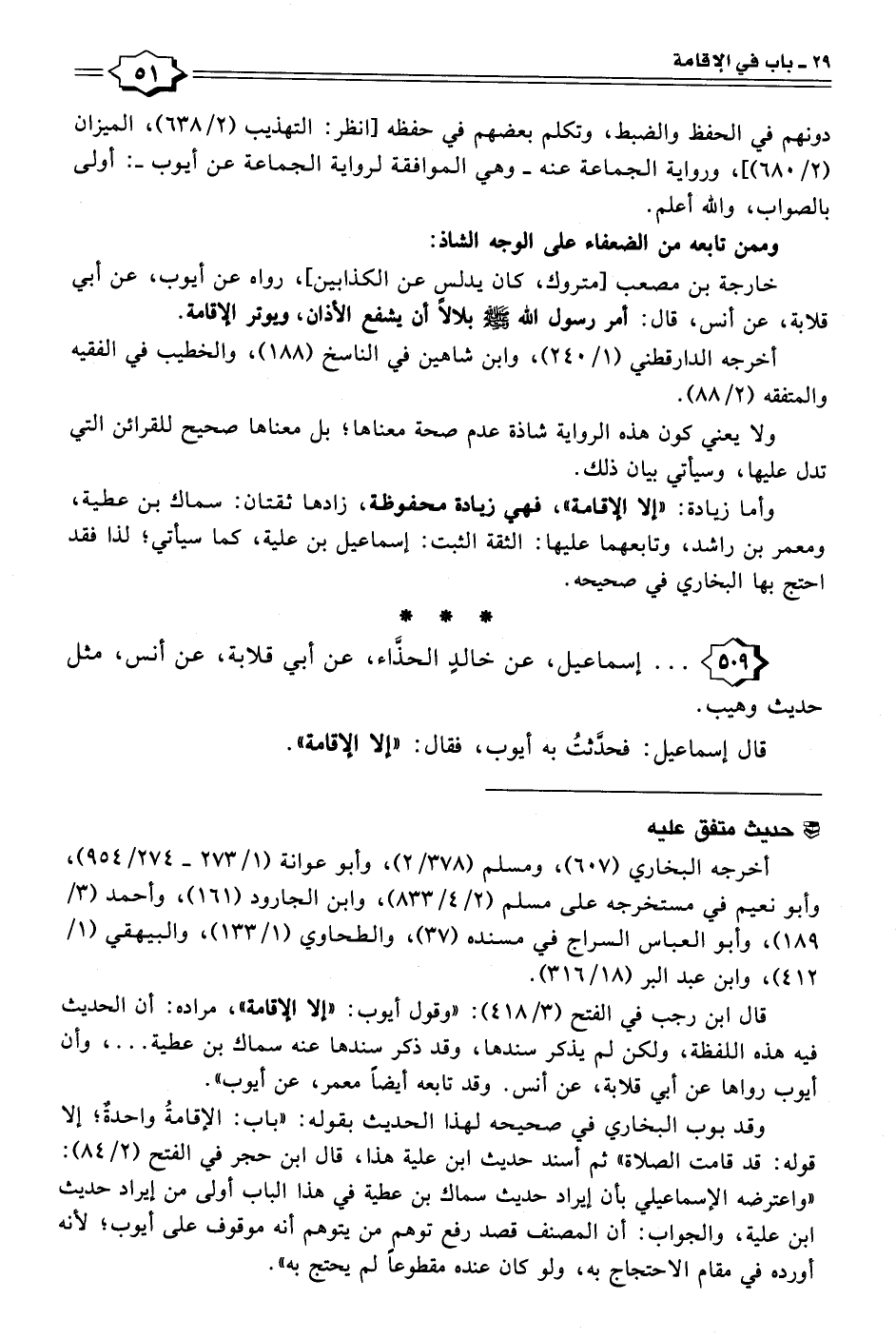 وقد بوب البخاري في صحيحه لهذا الحديث بقوله: "باب: الإقامةُ واحدةٌ؛ إلا قوله: قد قامت الصلاة" ثم أسند حديث ابن علية هذا، قال ابن حجر في الفتح (٢/ ٨٤): "واعترضه الإسماعيلي بأن إيراد حديث سماك بن عطية في هذا الباب أولى من إيراد حديث ابن علية، والجواب: أن المصنف قصد رفع توهم من يتوهم أنه موقوف على أيوب؛ لأنه أورده في مقام الاحتجاج به، ولو كان عنده مقطوعًا لم يحتج به".