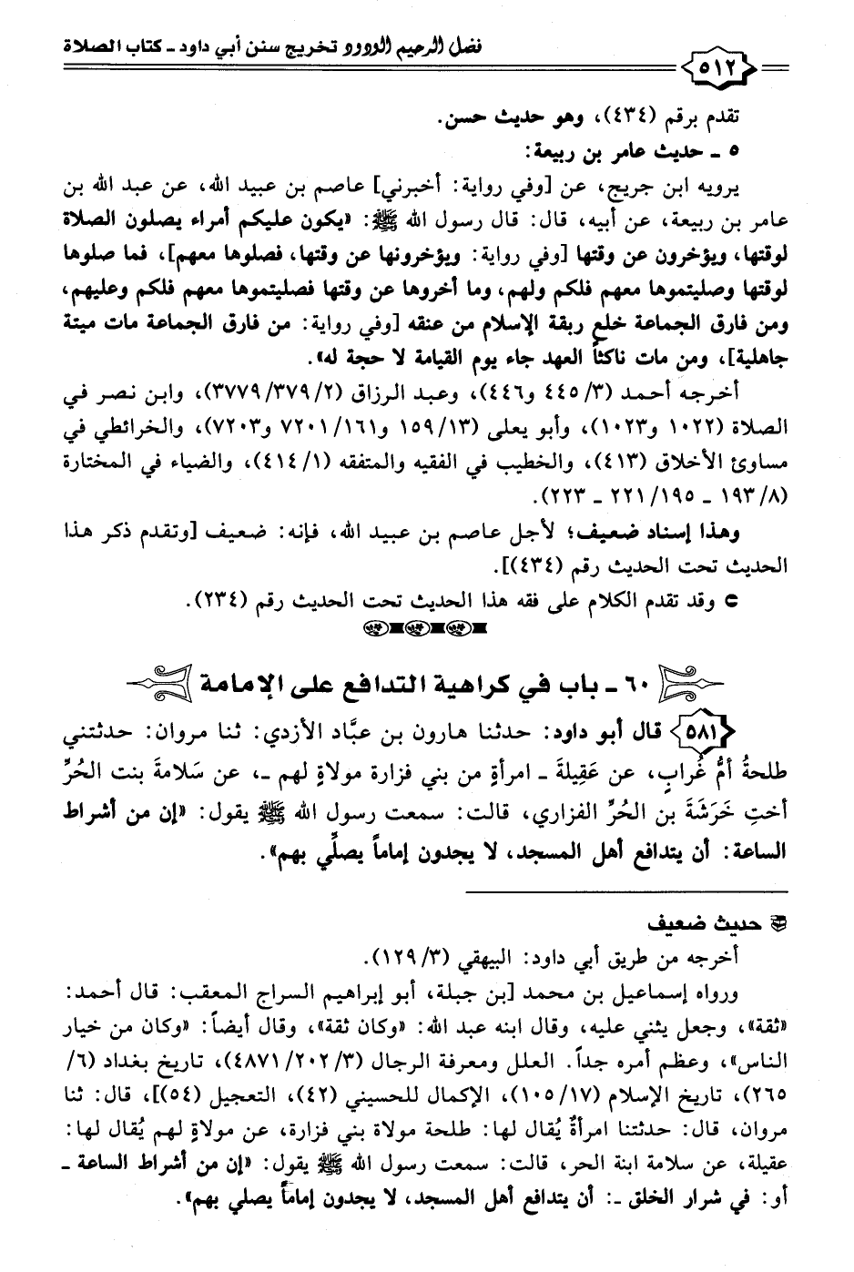 ٥٨١ - قال أبو داود: حدثنا هارون بن عبَّاد الأزدي: ثنا مروان: حدثتني طلحةُ أمُّ غُرابِ، عن عَقِيلةَ -امرأةٍ من بني فزارة مولاةٍ لهم-، عن سَلامةَ بنت الحُرِّ أختِ خَرَشَةَ بن الحُرِّ الفزاري، قالت: سمعت رسول الله - صلى الله عليه وسلم - يقول: "إن من أشراط الساعة: أن يتدافع أهل المسجد، لا يجدون إمامًا يصلِّي بهم".