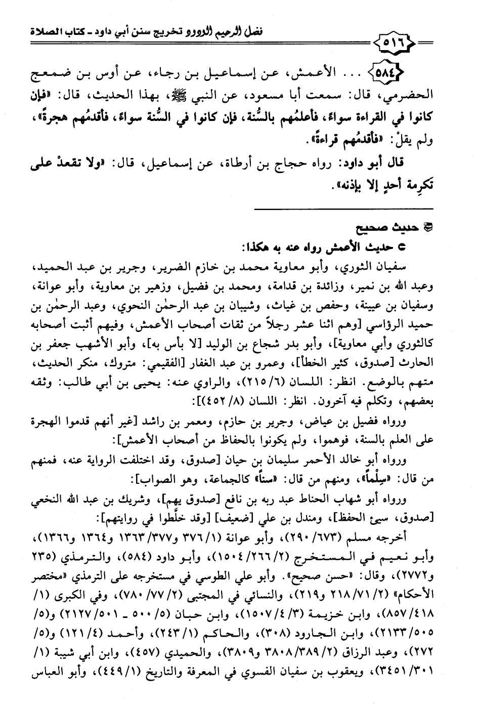 ٥٨٤ - . . . الأعمش، عن إسماعيل بن رجاء، عن أوس بن ضمعج الحضرمي، قال: سمعت أبا مسعود، عن النبي - صلى الله عليه وسلم -، بهذا الحديث، قال: "فإن كانوا في القراءة سواءً، فأعلمُهم بالسُّنة، فإن كانوا في السُّنة سواءً، فأقدمُهم هجرةً"، ولم يقلْ: "فأقدمُهم قراءةً".