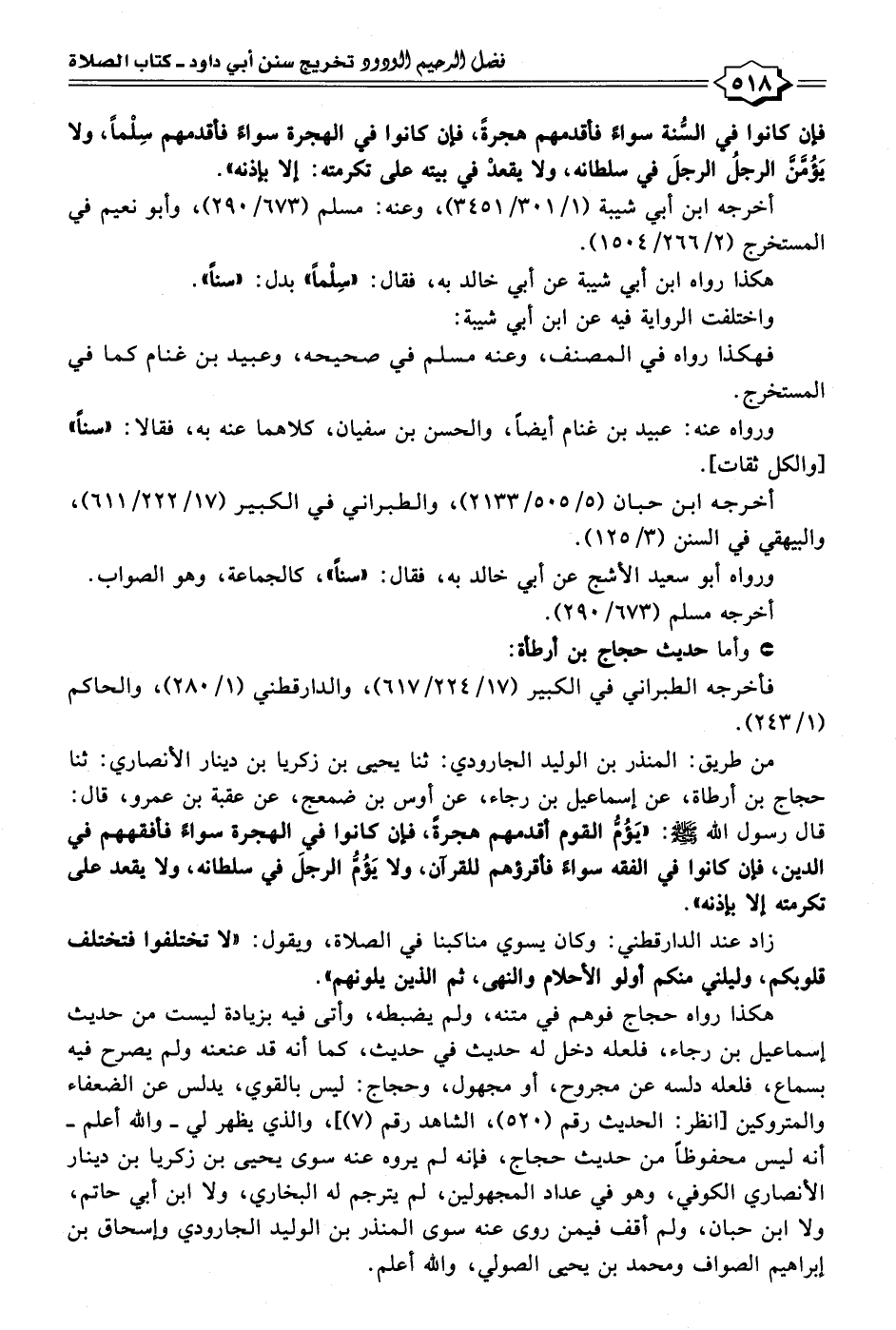 من طريق: المنذر بن الوليد الجارودي: ثنا يحيى بن زكريا بن دينار الأنصاري: ثنا حجاج بن أرطأة، عن إسماعيل بن رجاء، عن أوس بن ضمعج، عن عقبة بن عمرو، قال: قال رسول الله - صلى الله عليه وسلم -: "يَؤُمُّ القوم أقدمهم هجرةً، فإن كانوا في الهجرة سواءً فأفقههم في الدين، فإن كانوا في الفقه سواء فأقرؤهم للقرآن، ولا يَؤُمُّ الرجلَ في سلطانه، ولا يقعد على تكرمته إلا بإذنه".