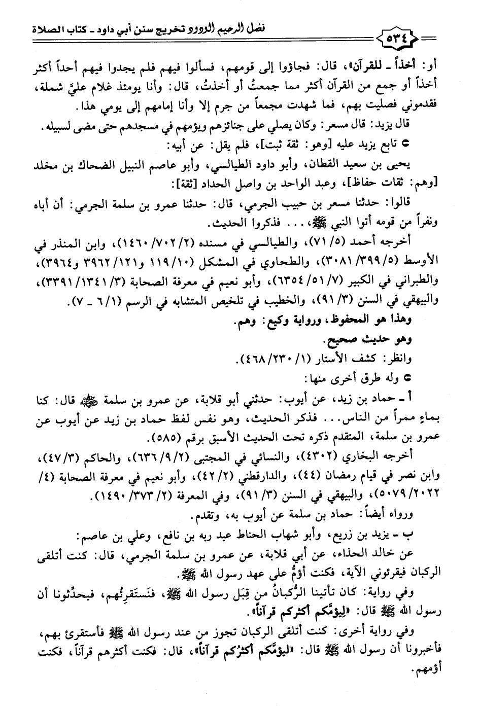 أ - حماد بن زيد، عن أيوب: حدثني أبو قلابة، عن عمرو بن سلمة - رضي الله عنه - قال: كنا بماءٍ ممرًا من الناس ... فذكر الحديث، وهو نفس لفظ حماد بن زيد عن أيوب عن عمرو بن سلمة، المتقدم ذكره تحت الحديث الأسبق برقم (٥٨٥).