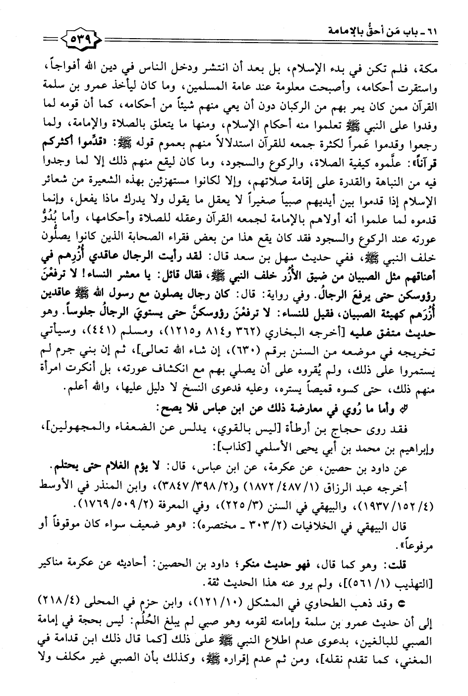 • وقد ذهب الطحاوي في المشكل (١٠/ ١٢١)، وابن حزم في المحلى (٤/ ٢١٨) إلى أن حديث عمرو بن سلمة وإمامته لقومه وهو صبي لم يبلغ الحُلُم: ليس بحجة في إمامة الصبي للبالغين، بدعوى عدم اطلاع النبي - صلى الله عليه وسلم - على ذلك [كما قال ذلك ابن قدامة في المغني، كما تقدم نقله]، ومن ثم عدم إقراره - صلى الله عليه وسلم -، وكذلك بأن الصبي غير مكلف ولا