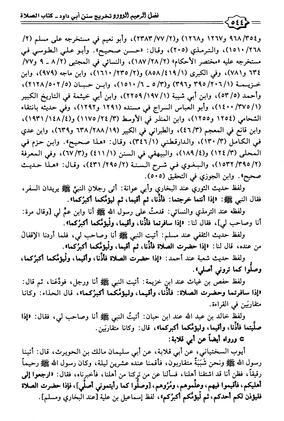 و ٣٥٤/ ٩٦٨ و ١٢٦٧ و ١٢٦٨) و (٢/ ٧٧/ ٢٣٨٣)، وأبو نعيم في مستخرجه على مسلم (٢/ ٢٦٨/ ١٥١٠)، والترمذي (٢٠٥)، وقال: "حسن صحيح". وأبو علي الطوسي في مستخرجه عليه "مختصر الأحكام" (٢/ ٢٨/ ١٨٧)، والنسائي في المجتبى (٢/ ٨ - ٩ و ٧٧/ ٦٣٤ و ٧٨١)، وفي الكبرى (١/ ٤١٩/ ٨٥٨) و (٢/ ٢٣٥/ ١٦١٠)، وابن ماجه (٩٧٩)، وابن خزيمة (١/ ٢٠٦/ ٣٩٥ و ٣٩٦) و (٣/ ٥ - ٦/ ١٥١٠)، وابن حبان (٥/ ٥٠٢/ ٢١٢٨)، وأحمد (٥/ ٥٣)، وابن أبي شيبة (١/ ١٩٧/ ٢٢٥٩)، وابن أبي خيثمة في التاريخ الكبير (١/ ٣٧٥/ ١٤٠٠)، وأبو العباس السراج في مسنده (١٢٩١ و ١٢٩٢)، وفي حديثه بانتقاء الشحامي (١٢٥٤ و ١٢٥٥)، وابن المنذر في الأوسط (٣/ ٢٤/ ١١٧٥) و (٤/ ١٤٨/ ١٩٣١)، وابن قانع في المعجم (٣/ ٤٦)، والطبراني في الكبير (١٩/ ٢٨٨/ ٦٣٨ و ٦٣٩)، وابن عدي في الكامل (٣/ ١٣٠)، والدارقطني (١/ ٣٤٦)، وقال: "هذا صحيح". وابن حزم في المحلى (٣/ ١٢٤) و (٤/ ١٨٩)، والبيهقي في السنن (١/ ٤١١) و (٣/ ٦٧)، وفي المعرفة (٢/ ٣٩٥/ ١٥٣٢)، والبغوي في شرح السنة (٢/ ٢٩٥/ ٤٣١)، وقال: "هذا حديث صحيح". وابن الجوزي في التحقيق (٥٠٥).