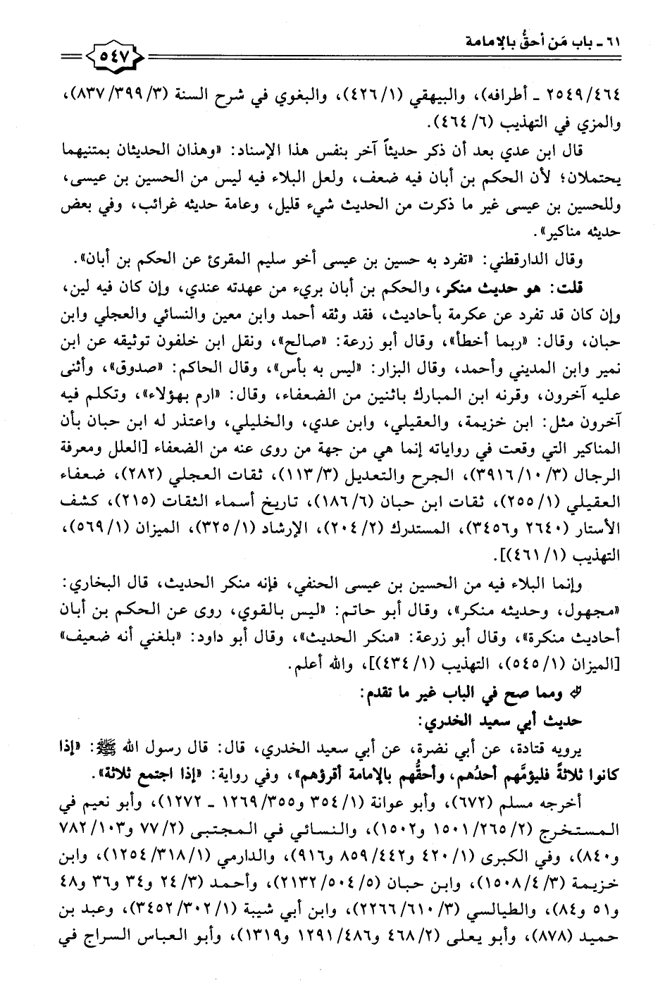 يرويه قتادة، عن أبي نضرة، عن أبي سعيد الخدري، قال: قال رسول الله - صلى الله عليه وسلم -: "إذا كانوا ثلاثةً فليؤمَّهم أحدُهم، وأحقهم بالإمامة أقرؤهم"، وفي رواية: "إذا اجتمع ثلاثة".