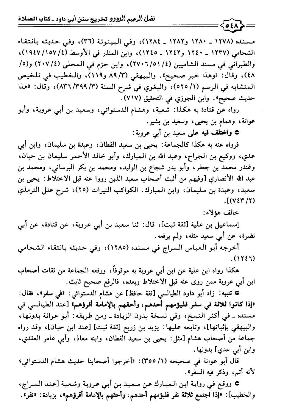 • تنبيه: زاد أبو داود الطيالسي [ثقة حافظ] عن هشام الدستوائي: "في سفر"، فقال: "إذا كانوا ثلاثة في سفر فليؤمهم أحدهم، وأحقهم بالإمامة أقرؤهم" [عند الطيالسي في مسنده - في أكثر النسخ، وفي نسخة بدون الزيادة - ومن طريقه: أبو عوانة بدونها، والبيهقي بإثباتها]، وتابعه عليها: يزيد بن زريع [ثقة ثبت] [عند ابن حبان]، وقد رواه جماعة من أصحاب هشام [مثل: يحيى بن سعيد القطان، وابنه معاذ، وأبي عامر العقدي، وابن أبي عدي] بدونها.