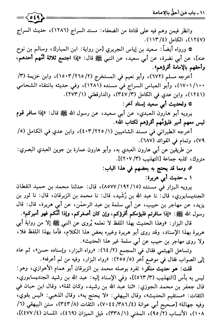 يرويه أبو هارون العبدي، عن أبي سعيد، عن رسول الله - صلى الله عليه وسلم - قال: "إذا سافر قوم ليس معهم أمير فليؤمَّهم أقرؤهم لكتاب الله".