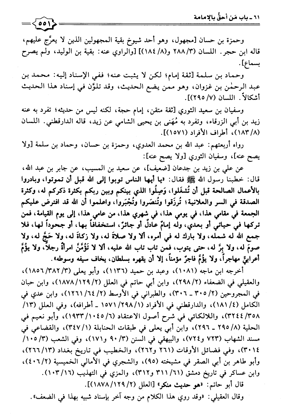 عن علي بن زيد بن جدعان [ضعيف]، عن سعيد بن المسيب، عن جابر بن عبد الله، قال: خطبنا رسول الله - صلى الله عليه وسلم - فقال: "يا أيها الناس توبوا إلى الله قبل أن تموتوا، وبادروا بالأعمال الصالحة قبل أن تُشغَلوا، وَصِلُوا الذي بينكم وبين ربكم بكثرة ذكركم له، وكثرة الصدقة في السر والعلانية؛ تُرزَقوا وتُنصَروا وتُجْبَروا، واعلموا أن الله قد افترض عليكم الجمعة في مقامي هذا، في يومي هذا، في شهري هذا، من عامي هذا، إلى يوم القيامة، فمن تركها في حياتي أو بعدي، وله إمامٌ عادلٌ أو جائرٌ، استخفافًا بها، أو جحودًا لها، فلا جمع الله له شمله، ولا بارك له في أمره، ألا ولا صلاةَ له، ولا زكاةَ له، ولا حَجَّ له، ولا صومَ له، ولا بِرَّ له، حتى يتوب، فمن تاب تاب الله عليه، ألا لا تَؤُمَّنَّ امرأةٌ رجلًا، ولا يؤُمَّ أعرابيٌّ مهاجرًا، ولا يؤُمُّ فاجرٌ مؤمنًا، إلا أن يقهره بسلطان، يخاف سيفه وسوطه".
