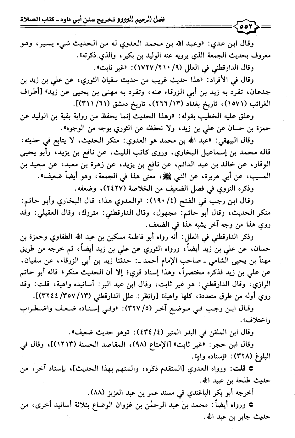 وقال البيهقي: "عبد الله بن محمد هو العدوي: منكر الحديث، لا يتابع في حديثه، قاله محمد بن إسماعيل البخاري، وروى كاتب الليث، عن نافع بن يزيد، وأبو يحيى الوقار، عن خالد بن عبد الدائم، عن نافع بن يزيد، عن زهرة بن معبد، عن سعيد بن المسيب، عن أبي هريرة، عن النبي - صلى الله عليه وسلم -، معنى هذا في الجمعة، وهو أيضًا ضعيف".