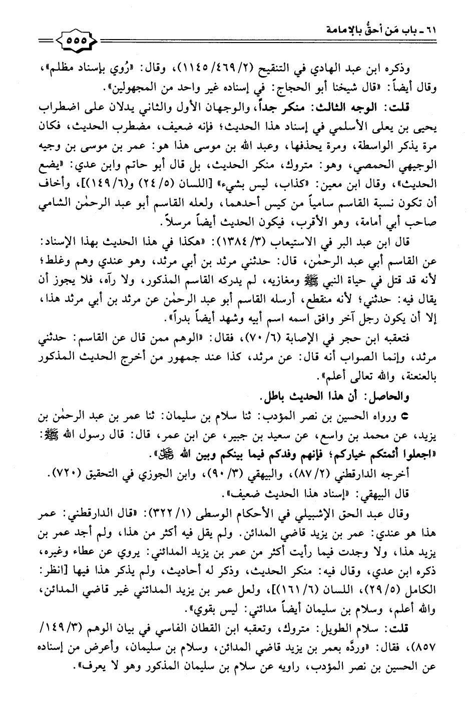 وقال عبد الحق الإشبيلي في الأحكام الوسطى (١/ ٣٢٢): "قال الدارقطني: عمر هذا هو عندي: عمر بن يزيد قاضي المدائن. ولم يقل فيه أكثر من هذا، ولم أجد عمر بن يزيد هذا، ولا وجدت فيما رأيت أكثر من عمر بن يزيد المدائني: يروي عن عطاء وغيره، ذكره ابن عدي، وقال فيه: منكر الحديث، وذكر له أحاديث، ولم يذكر هذا فيها [انظر: الكامل (٥/ ٢٩)، اللسان (٦/ ١٦١)]، ولعل عمر بن يزيد المدائني غير قاضي المدائن، والله أعلم، وسلام بن سليمان أيضًا مدائني: ليس بقوي".