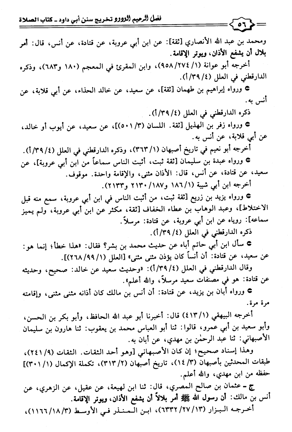 ومحمد بن عبد الله الأنصاري [ثقة]: عن ابن أبي عروبة، عن قتادة، عن أنس، قال: أمر بلال أن يشفع الأذان، ويوتر الإقامة.