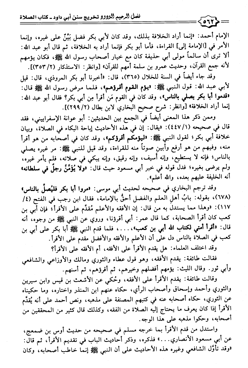 وقد ترجم البخاري في صحيحه لحديث أبي موسى: "مروا أبا بكر فليُصلِّ بالناس" (٦٧٨)، بقوله: بابُ أهلِ العلم والفضل أحقُّ بالإمامة، فقال ابن رجب في الفتح (٤/ ١١٧): "وهذا مما يستدل به من قال: إن الأفقه والأعلم مُقدَّم على الأقرأ؛ فإن أبي بن كعب كان أقرأ الصحابة، كما قال عمر: أبي أقرؤنا، وروي عن النبي - صلى الله عليه وسلم - من وجوه، أنه قال: "أقرأ أمتي لكتاب الله أبي بن كعب"، ... ، فلما قدم النبي - صلى الله عليه وسلم - أبا بكر على أبي بن كعب في الصلاة بالناس دل على أن الأعلم والأفقه والأفضل مقدم على الأقرأ.