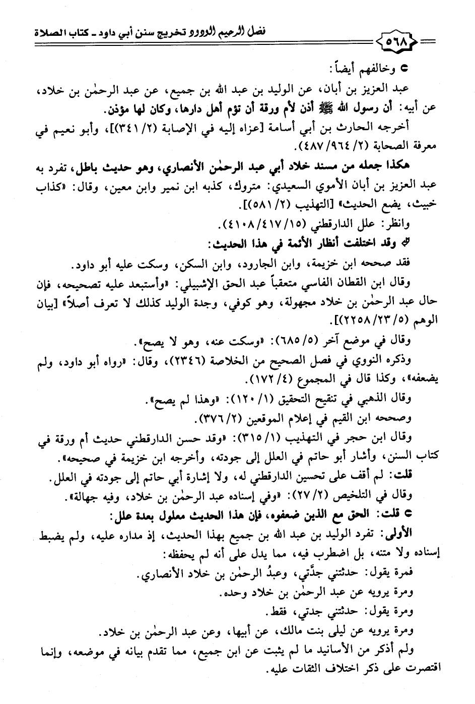 وقال ابن حجر في التهذيب (١/ ٣١٥): "وقد حسن الدارقطني حديث أم ورقة في كتاب السنن، وأشار أبو حاتم في العلل إلى جودته، وأخرجه ابن خزيمة في صحيحه".