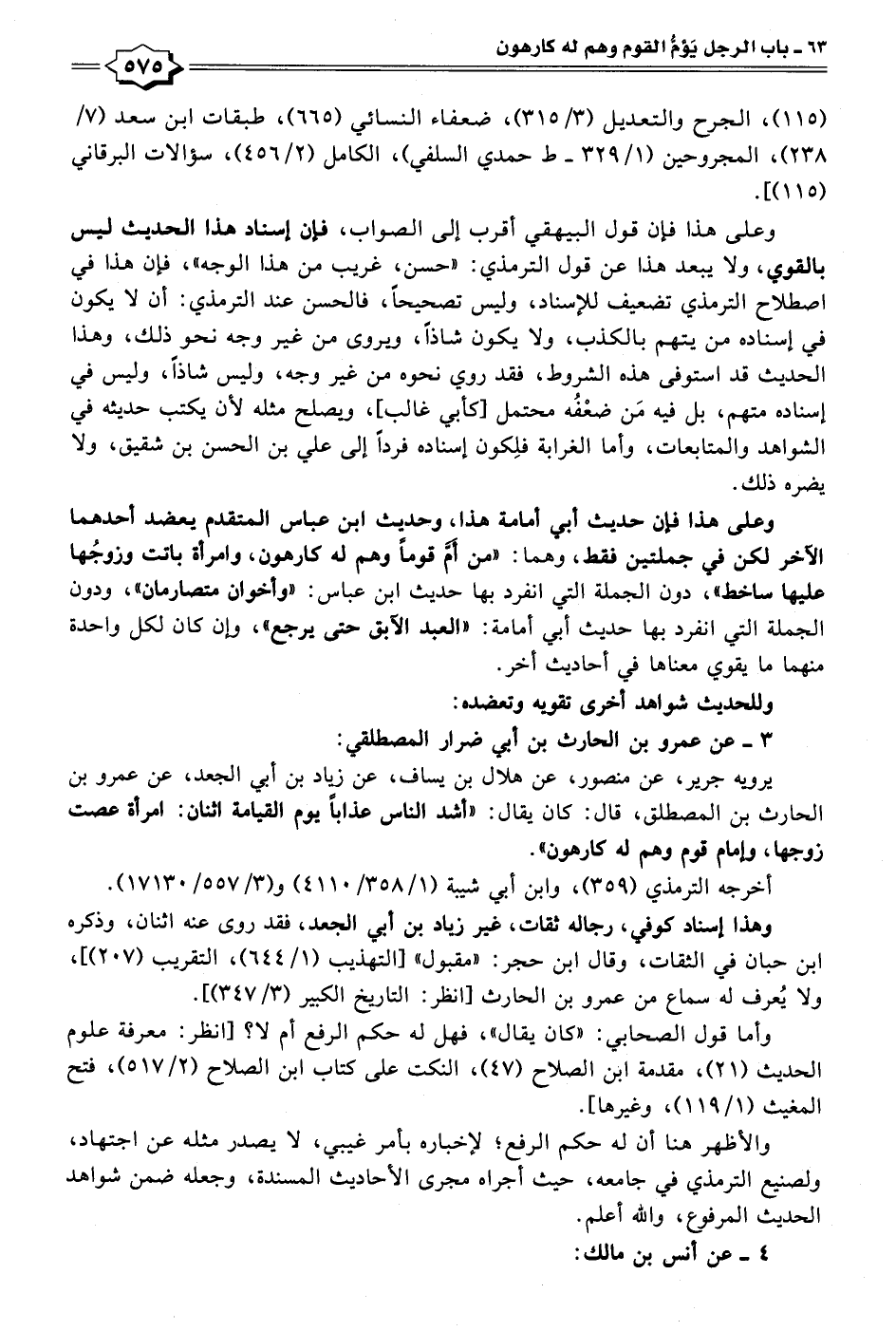 يرويه جرير، عن منصور، عن هلال بن يساف، عن زياد بن أبي الجعد، عن عمرو بن الحارث بن المصطلق، قال: كان يقال: "أشد الناس عذابًا يوم القيامة اثنان: امرأة عصت زوجها، وإمام قوم وهم له كارهون".