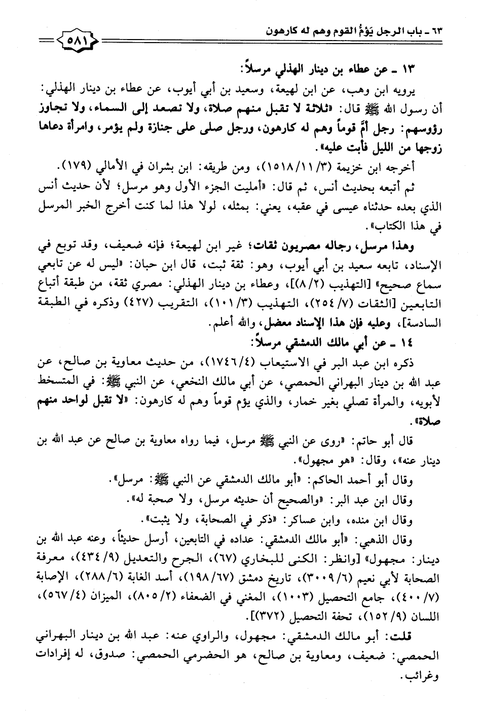 يرويه ابن وهب، عن ابن لهيعة، وسعيد بن أبي أيوب، عن عطاء بن دينار الهذلي: أن رسول الله - صلى الله عليه وسلم - قال: "ثلاثة لا تقبل منهم صلاة، ولا تصعد إلى السماء، ولا تجاوز رؤوسهم: رجل أمَّ قومًا وهم له كارهون، ورجل صلى على جنازة ولم يؤمر، وامرأة دعاها زوجها من الليل فأبت عليه".