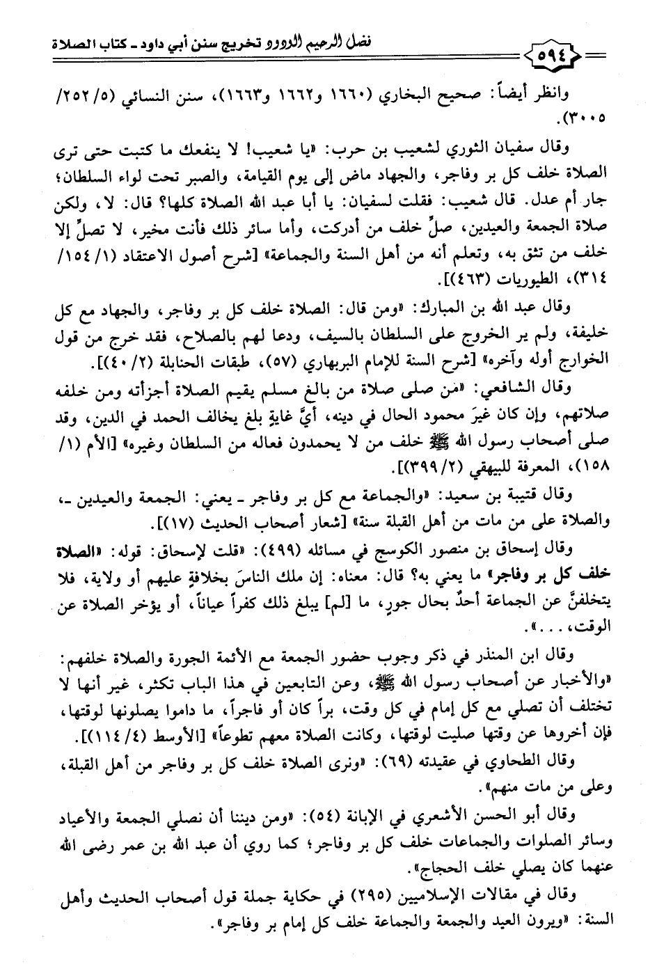 وقال قتيبة بن سعيد: "والجماعة مع كل بر وفاجر -يعني: الجمعة والعيدين-، والصلاة على من مات من أهل القبلة سنة" أشعار أصحاب الحديث (١٧)].