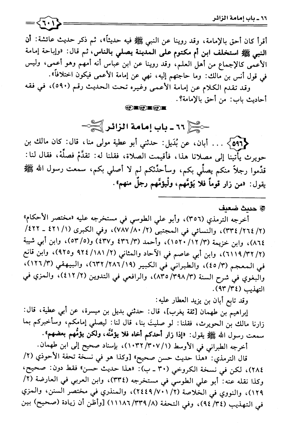 إبراهيم بن طهمان [ثقة يغرب]، قال: حدثني بديل بن ميسرة، عن أبي عطية، قال: زارنا مالك بن الحويرث، فقلنا: لو صليتَ بنا، قال لنا: ليصلي إمامكم، وسأخبركم بما سمعت رسول الله - صلى الله عليه وسلم - يقول: "إذا زار أحدكم أخاه فلا يؤمَّنَّه ولكن يؤمُّهم بعضهم".