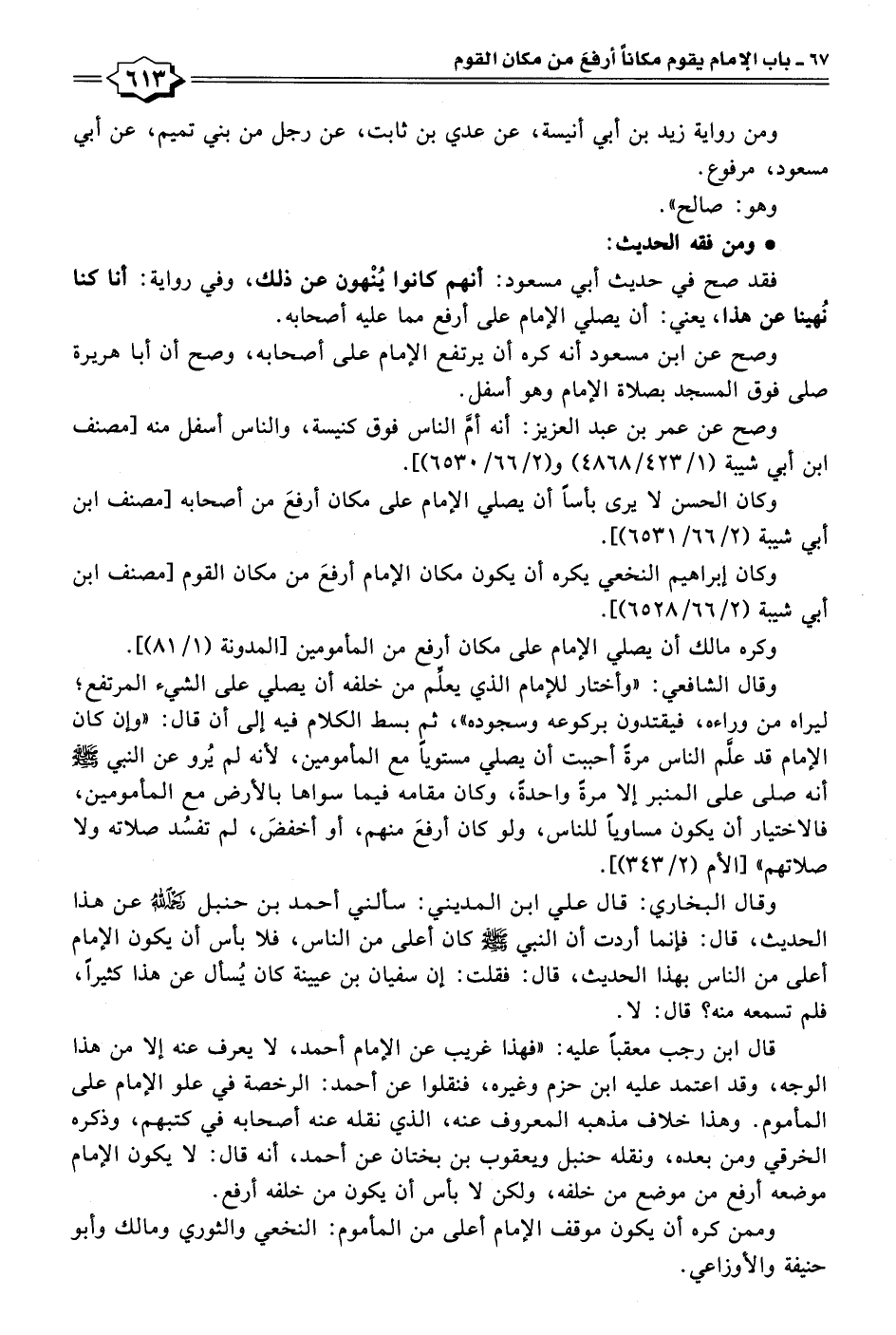 قال ابن رجب معقبًا عليه: "فهذا غريب عن الإمام أحمد، لا يعرف عنه إلا من هذا الوجه، وقد اعتمد عليه ابن حزم وغيره، فنقلوا عن أحمد: الرخصة في علو الإمام على المأموم. وهذا خلاف مذهبه المعروف عنه، الذي نقله عنه أصحابه في كتبهم، وذكره الخرقي ومن بعده، ونقله حنبل ويعقوب بن بختان عن أحمد، أنه قال: لا يكون الإمام موضعه أرفع من موضع من خلفه، ولكن لا بأس أن يكون من خلفه أرفع.