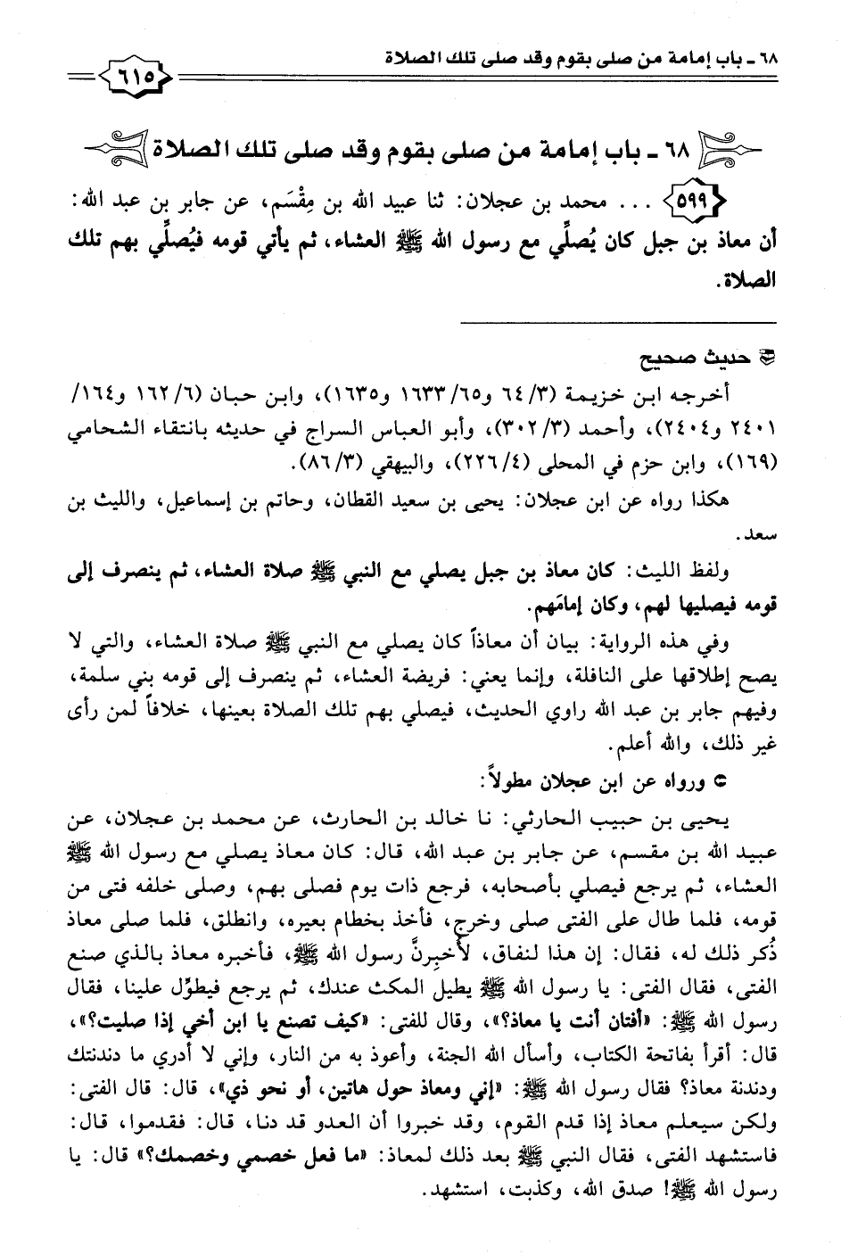 يحيى بن حبيب الحارثي: نا خالد بن الحارث، عن محمد بن عجلان، عن عبيد الله بن مقسم، عن جابر بن عبد الله، قال: كان معاذ يصلي مع رسول الله - صلى الله عليه وسلم - العشاء، ثم يرجع فيصلي بأصحابه، فرجع ذات يوم فصلى بهم، وصلى خلفه فتى من قومه، فلما طال على الفتى صلى وخرج، فأخذ بخطام بعيره، وانطلق، فلما صلى معاذ ذُكر ذلك له، فقال: إن هذا لنفاق، لأُخبِرنَّ رسول الله - صلى الله عليه وسلم -، فأخبره معاذ بالذي صنع الفتى، فقال الفتى: يا رسول الله - صلى الله عليه وسلم - يطيل المكث عندك، ثم يرجع فيطوِّل علينا، فقال رسول الله - صلى الله عليه وسلم -: "أفتان أنت يا معاذ؟ "، وقال للفتى: "كيف تصنع يا ابن أخي إذا صليت؟ "، قال: أقرأ بفاتحة الكتاب، وأسأل الله الجنة، وأعوذ به من النار، وإني لا أدري ما دندنتك ودندنة معاذ؟ فقال رسول الله - صلى الله عليه وسلم -: "إني ومعاذ حول هاتين، أو نحو ذي"، قال: قال الفتى: ولكن سيعلم معاذ إذا قدم القوم، وقد خبروا أن العدو قد دنا، قال: فقدموا، قال: فاستشهد الفتى، فقال النبي - صلى الله عليه وسلم - بعد ذلك لمعاذ: "ما فعل خصمي وخصمك؟ " قال: يا رسول الله - صلى الله عليه وسلم -! صدق الله، وكذبت، استشهد.