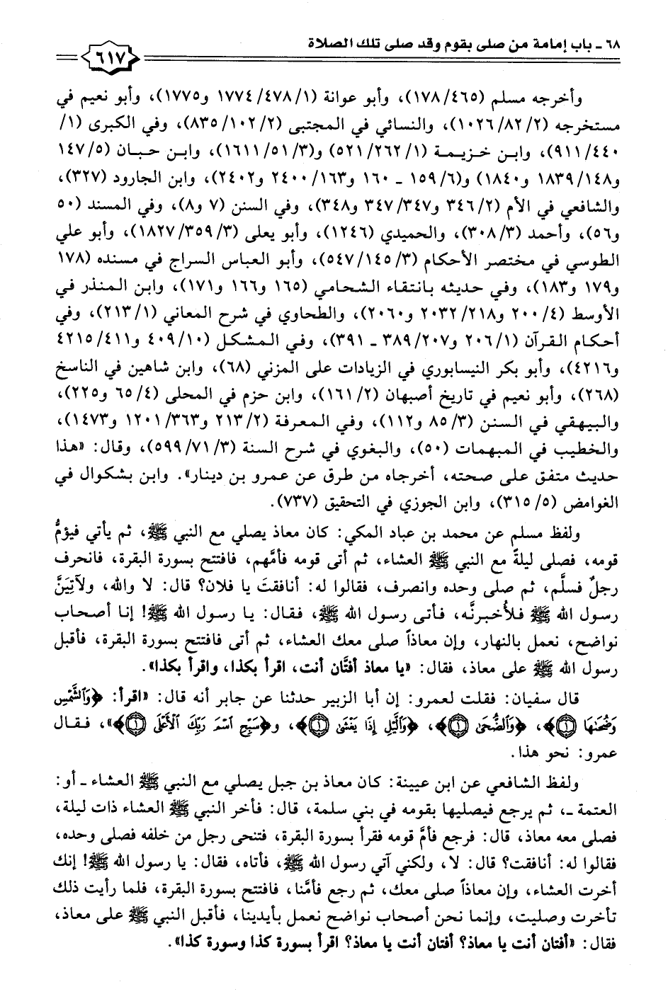 ولفظ الشافعي عن ابن عيينة: كان معاذ بن جبل يصلي مع النبي - صلى الله عليه وسلم - العشاء -أو: العتمة-، ثم يرجع فيصليها بقومه في بني سلمة، قال: فأخر النبي - صلى الله عليه وسلم - العشاء ذات ليلة، فصلى معه معاذ، قال: فرجع فأمَّ قومه فقرأ بسورة البقرة، فتنحى رجل من خلفه فصلى وحده، فقالوا له: أنافقت؟ قال: لا، ولكني آتي رسول الله - صلى الله عليه وسلم -، فأتاه، فقال: يا رسول الله - صلى الله عليه وسلم -! إنك أخرت العشاء، وإن معاذًا صلى معك، ثم رجع فأمَّنا، فافتتح بسورة البقرة، فلما رأيت ذلك تأخرت وصليت، وإنما نحن أصحاب نواضح نعمل بأيدينا، فاقبل النبي - صلى الله عليه وسلم - على معاذ، فقال: "أفتان أنت يا معاذ؟ أفتان أنت يا معاذ؟ اقرأ بسورة كذا وسورة كذا".