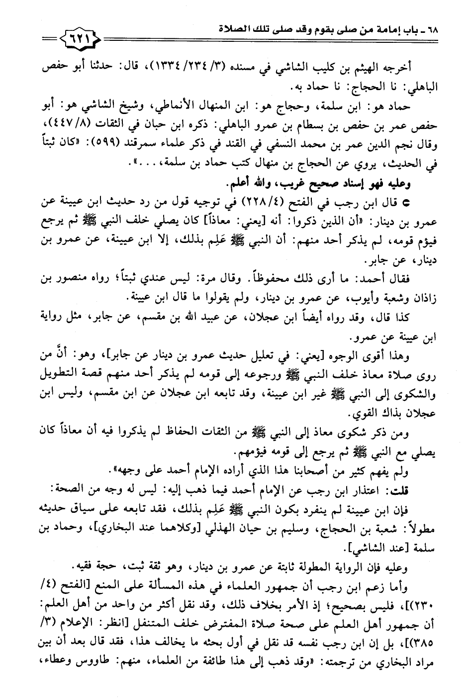 • قال ابن رجب في الفتح (٤/ ٢٢٨) في توجيه قول من رد حديث ابن عيينة عن عمرو بن دينار: "أن الذين ذكروا: أنه [يعني: معاذًا] كان يصلي خلف النبي - صلى الله عليه وسلم - ثم يرجع فيؤم قومه، لم يذكر أحد منهم: أن النبي - صلى الله عليه وسلم - عَلِم بذلك، إلا ابن عيينة، عن عمرو بن دينار، عن جابر.