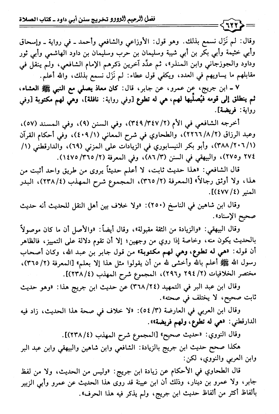 ٧ - ابن جريج، عن عمرو، عن جابر، قال: كان معاذ يصلي مع النبي - صلى الله عليه وسلم - العشاء، ثم ينطلق إلى قومه فيُصلِّيها لهم، هي له تطوع [وفي رواية: نافلة]، وهي لهم مكتوبة [وفي رواية: فريضة].