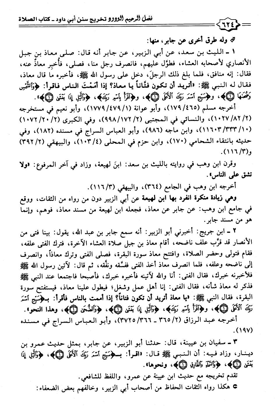١ - الليث بن سعد، عن أبي الزبير، عن جابر أنه قال: صلى معاذ بن جبل الأنصاري لأصحابه العشاء، فطوَّل عليهم، فانصرف رجل منا، فصلى، فأُخبِر معاذٌ عنه، فقال: إنه منافق، فلما بلغ ذلك الرجلَ، دخل على رسول الله - صلى الله عليه وسلم -، فأخبره ما قال معاذ، فقال له النبي - صلى الله عليه وسلم -: "أتريد أن تكون فتَّانًا يا معاذ؟ إذا أمَمْتَ الناس فاقرأ: {وَالشَّمْسِ وَضُحَاهَا (١)}، و {سَبِّحِ اسْمَ رَبِّكَ الْأَعْلَى (١)}، {اقْرَأْ بِاسْمِ رَبِّكَ} , {وَاللَّيْلِ إِذَا يَغْشَى (١)} ".