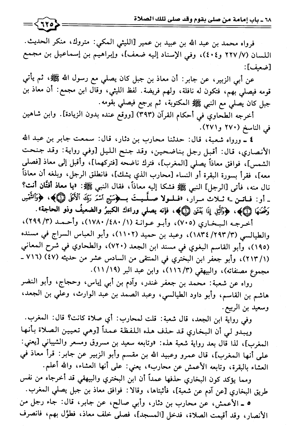 ٤ - ورواه شعبة، قال: حدثنا محارب بن دثار، قال: سمعت جابر بن عبد الله الأنصاري، قال: أقبل رجل بناضحين، وقد جنح الليل [وفي رواية: وقد جنحت الشمس]، فوافق معاذًا يصلي [المغرب]، فترك ناضحه [فتركهما]، وأقبل إلى معاذ [فصلى معه]، فقرأ بسورة البقرة أو النساء [محارب الذي يشك]، فانطلق الرجل، وبلغه أن معاذًا نال منه، فأتي [الرجل] النبي - صلى الله عليه وسلم - فشكا إليه معاذًا، فقال النبي - صلى الله عليه وسلم -: "يا معاذ أفتَّان أنت؟ -أو: فاتن-" ثلاث مرار، "فلولا صلَّيتَ بـ {سَبِّحِ اسْمَ رَبِّكَ الْأَعْلَى (١)}، {وَالشَّمْسِ وَضُحَاهَا (١)}، {وَاللَّيْلِ إِذَا يَغْشَى (١)}، فإنه يصلي وراءك الكبيرُ والضعيفُ وذو الحاجة".