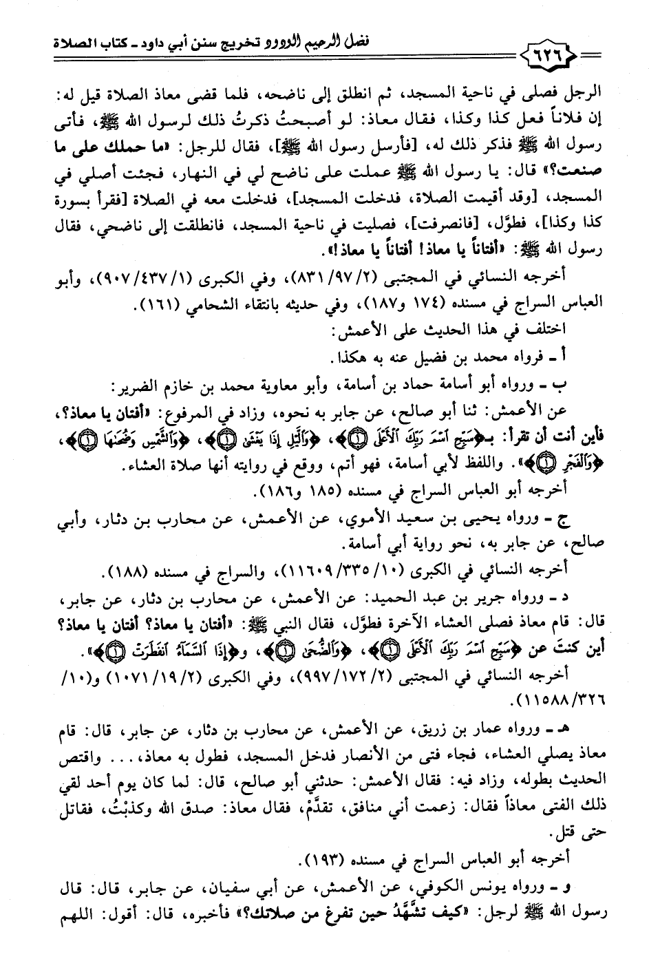 د- ورواه جرير بن عبد الحميد: عن الأعمش، عن محارب بن دثار، عن جابر، قال: قام معاذ فصلى العشاء الآخرة فطوَّل، فقال النبي - صلى الله عليه وسلم -: "أفتان يا معاذ؟ أفتان يا معاذ؟ أين كنتَ عن {سَبِّحِ اسْمَ رَبِّكَ الْأَعْلَى (١)} , {وَالضُّحَى (١)} , {إِذَا السَّمَاءُ انْفَطَرَتْ (١)} ".