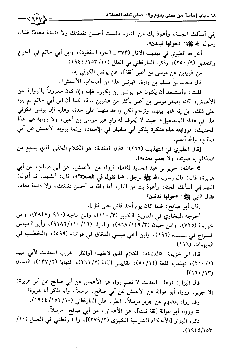 • خالفه: جرير بن عبد الحميد [ثقة]، فرواه عن الأعمش، عن أبي صالح، عن أبي هريرة، قال: قال رسول الله - صلى الله عليه وسلم - لرجل: "ما تقول في الصلاة؟ "، قال: أتشهد، ثم أقول: اللهم إني أسألك الجنة، وأعوذ بك من النار، أما والله ما أحسن دندنتك، ولا دندنة معاذ، فقال النبي - صلى الله عليه وسلم -: "حولها ندندن".