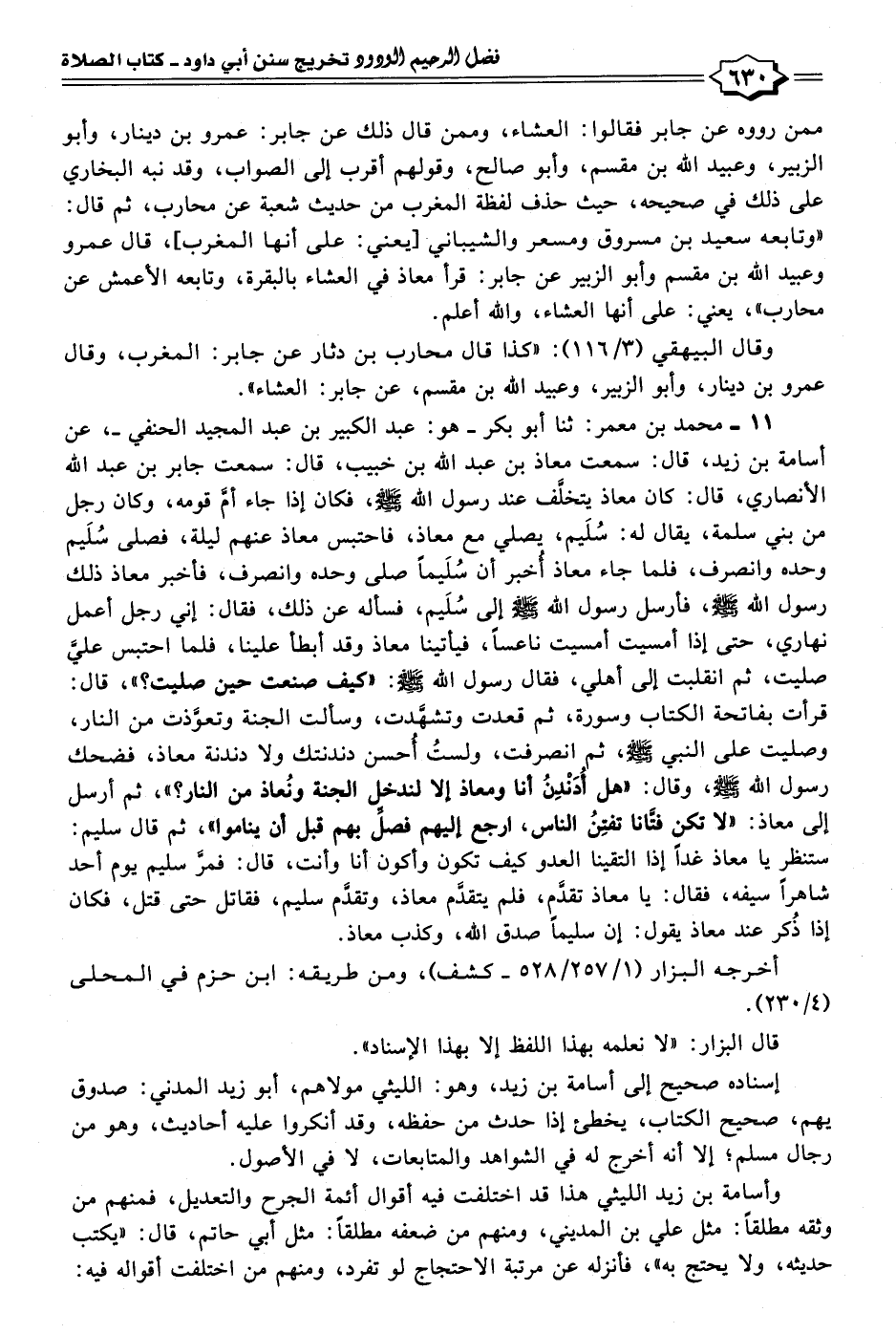 ١١ - محمد بن معمر: ثنا أبو بكر -هو: عبد الكبير بن عبد المجيد الحنفي-، عن أسامة بن زيد، قال: سمعت معاذ بن عبد الله بن خبيب، قال: سمعت جابر بن عبد الله الأنصاري، قال: كان معاذ يتخلَّف عند رسول الله - صلى الله عليه وسلم -، فإن إذا جاء أمَّ قومه، وكان رجل من بني سلمة، يقال له: سُلَيم، يصلي مع معاذ، فاحتبس معاذ عنهم ليلة، فصلى سُلَيم وحده وانصرف، فلما جاء معاذ اخبر أن سُلَيمًا صلى وحده وانصرف، فأخبر معاذ ذلك رسول الله - صلى الله عليه وسلم -، فأرسل رسول الله - صلى الله عليه وسلم - إلى سُلَيم، فسأله عن ذلك، فقال: إني رجل أعمل نهاري، حتى إذا أمسيت أمسيت ناعسًا، فيأتينا معاذ وقد أبطأ علينا، فلما احتبس عليَّ صليت، ثم انقلبت إلى أهلي، فقال رسول الله - صلى الله عليه وسلم -: "كيف صنعت حين صليت؟ "، قال: قرأت بفاتحة الكتاب وسورة، ثم قعدت وتشهَّدت، وسألت الجنة وتعوَّذت من النار، وصليت على النبي - صلى الله عليه وسلم -، ثم انصرفت، ولستُ أُحسن دندنتك ولا دندنة معاذ، فضحك رسول الله - صلى الله عليه وسلم -، وقال: "هل أُدَنْدِنُ أنا ومعاذ إلا لندخل الجنة ونُعاذ من النار؟ "، ثم أرسل إلى معاذ: "لا نكن فتَّانا تفتِنُ الناس، ارجع إليهم فصلَّ بهم قبل أن يناموا"، ثم قال سليم: ستنظر يا معاذ غدًا إذا التقينا العدو كيف تكون وأكون أنا وأنت، قال: فمرَّ سليم يوم أحد شاهرًا سيفه، فقال: يا معاذ تقدَّم، فلم يتقدَّم معاذ، وتقدَّم سليم، فقاتل حتى قتل، فإن إذا ذُكر عند معاذ يقول: إن سليمًا صدق الله، وكذب معاذ.