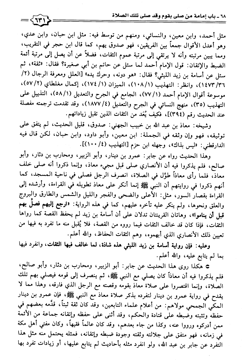 وهذا الحديث رواه عن جابر: عمرو بن دينار، وأبو الزبير، ومحارب بن دثار، وأبو صالح، فلم يذكروا فيه أن الأنصاري صلى قبل مجيء معاذ، وإنما ذكروا أنه صلى خلف معاذ، فلما رأي معاذًا طوَّل في الصلاة، انصرف الرجل فصلى في ناحية المسجد، كما أنهم ذكروا في روايتهم أن النبي - صلى الله عليه وسلم - إنما أنكر على معاذ تطويله في القراءة، وأرشده إلى القراءة بقصار السور، مثل: الأعلى والضحى والفجر والليل والشمس والطارق والبروج والعلق ونحوها، ولم ينكر عليه تأخره عليهم، كما في هذه الرواية: "ارجع إليهم فصلِّ بهم قبل أن يناموا"، وهاتان القرينتان تدلان على أن أسامة بن زيد لم يحفظ القصة كما رواها الثقات، فإذا كان قد خالف الثقات فيما رووه من القصة، فلا يُقبل منه ما تفرد به فيها من تعيين ذلك الأنصاري الذي أبهموه، وهم الثقات الحفاظ، والله أعلم.