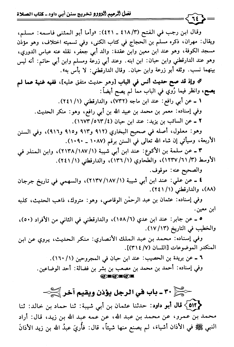 ٥١٢ - قال أبو داود: حدثنا عثمان بن أبي شيبة: ثنا حماد بن خالد: ثنا محمد بن عمرو، عن محمد بن عبد الله، عن عمه عبد الله بن زيد، قال: أراد النبي - صلى الله عليه وسلم - في الأذان أشياءَ, لم يصنع منها شيئًا، قال: فأُريَ عبدُ الله بن زيد الأذانَ